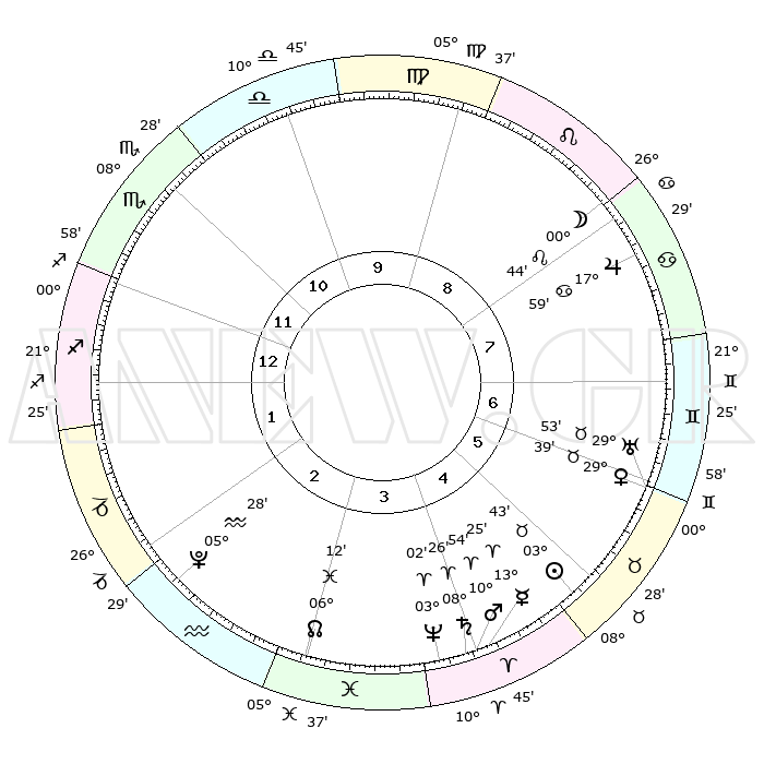 | | ΘΕΣΕΙΣ ΠΛΑΝΗΤΩΝ ΑΣΤΡΟΛΟΓΙΚΟΥ ΧΑΡΤΗ ΤΗΣ ΣΤΙΓΜΗΣ ΑΥΤΗΣ | | | | Πλανήτης | Ζώδιο | Μοίρες | Δεκαήμ. | Σε οίκο | Απόκλιση | | Ακμές των οίκων | | Ηλιος | Ταύρος | 03°39' | Πρώτο | 5 | 12 N 44 | | 1ος | 01°30' | Τοξότης | | Σελήνη | Καρκίνος | 29°49' | Τρίτο | 8 | 23 N 14 | | 2ος | 02°50' | Αιγόκερως | | Ερμής | Κριός | 13°18' | Δεύτερο | 4 | 02 N 57 | | 3ος | 08°47' | Υδροχόος | | Αφροδίτη | Ταύρος | 29°34' | Τρίτο | 6 | 20 N 37 | | 4ος | 14°52' | Ιχθείς | | Αρης | Κριός | 10°51' | Δεύτερο | 4 | 03 N 26 | | 5ος | 15°42' | Κριός | | Δίας | Καρκίνος | 17°58' | Δεύτερο | 8 | 22 N 37 | | 6ος | 10°33' | Ταύρος | | Κρόνος | Κριός | 08°26' | Πρώτο | 4 | 01 N 22 | | 7ος | 01°30' | Δίδυμοι | | Ουρανός | Ταύρος | 29°53' | Τρίτο | 6 | 19 N 57 | | 8ος | 02°50' | Καρκίνος | | Ποσειδώνας | Κριός | 03°02' | Πρώτο | 4 | 00 S 00 | | 9ος | 08°47' | Λέων | | Πλούτωνας | Υδροχόος | 05°28' | Πρώτο | 2 | 22 S 48 | | 10ος | 14°52' | Παρθένος | | Β. Δεσμός | Ιχθείς | 06°12' | Πρώτο | 3 | 09 S 14 | | 11ος | 15°42' | Ζυγός | | Ωροσκόπος | Τοξότης | 01°30' | Πρώτο | | | 12ος | 10°33' | Σκορπιός | | Μεσουράνημα | Παρθένος | 14°52' | Δεύτερο | | | |