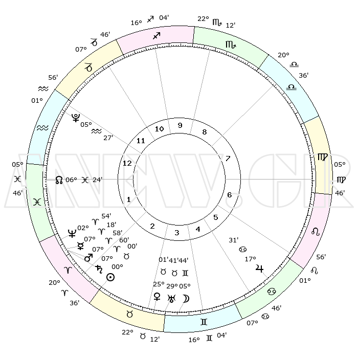 | | ΘΕΣΕΙΣ ΠΛΑΝΗΤΩΝ ΑΣΤΡΟΛΟΓΙΚΟΥ ΧΑΡΤΗ ΤΗΣ ΣΤΙΓΜΗΣ ΑΥΤΗΣ | | | | Πλανήτης | Ζώδιο | Μοίρες | Δεκαήμ. | Σε οίκο | Απόκλιση | | Ακμές των οίκων | | Ηλιος | Κριός | 29°57' | Τρίτο | 3 | 11 N 27 | | 1ος | 07°17' | Υδροχόος | | Σελήνη | Δίδυμοι | 04°54' | Πρώτο | 4 | 26 N 07 | | 2ος | 22°24' | Ιχθείς | | Ερμής | Κριός | 07°13' | Πρώτο | 2 | 00 N 27 | | 3ος | 29°35' | Κριός | | Αφροδίτη | Ταύρος | 24°57' | Τρίτο | 3 | 19 N 23 | | 4ος | 26°52' | Ταύρος | | Αρης | Κριός | 07°55' | Πρώτο | 2 | 02 N 16 | | 5ος | 19°10' | Δίδυμοι | | Δίας | Καρκίνος | 17°31' | Δεύτερο | 6 | 22 N 40 | | 6ος | 10°54' | Καρκίνος | | Κρόνος | Κριός | 07°59' | Πρώτο | 2 | 01 N 11 | | 7ος | 07°17' | Λέων | | Ουρανός | Ταύρος | 29°41' | Τρίτο | 4 | 19 N 55 | | 8ος | 22°24' | Παρθένος | | Ποσειδώνας | Κριός | 02°54' | Πρώτο | 2 | 00 S 03 | | 9ος | 29°35' | Ζυγός | | Πλούτωνας | Υδροχόος | 05°27' | Πρώτο | 12 | 22 S 48 | | 10ος | 26°52' | Σκορπιός | | Β. Δεσμός | Ιχθείς | 06°24' | Πρώτο | 1 | 09 S 10 | | 11ος | 19°10' | Τοξότης | | Ωροσκόπος | Υδροχόος | 07°17' | Πρώτο | | | 12ος | 10°54' | Αιγόκερως | | Μεσουράνημα | Σκορπιός | 26°52' | Τρίτο | | | |