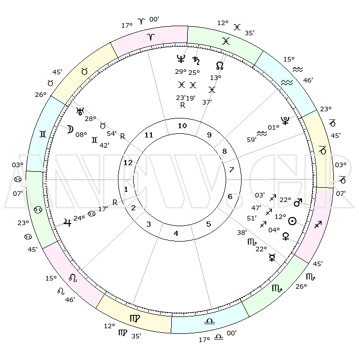 | | ΘΕΣΕΙΣ ΠΛΑΝΗΤΩΝ ΑΣΤΡΟΛΟΓΙΚΟΥ ΧΑΡΤΗ ΤΗΣ ΣΤΙΓΜΗΣ ΑΥΤΗΣ | | | | Πλανήτης | Ζώδιο | Μοίρες | Δεκαήμ. | Σε οίκο | Απόκλιση | | Ακμές των οίκων | | Ηλιος | Τοξότης | 12°44' | Δεύτερο | 6 | 22 S 19 | | 1ος | 18°55' | Δίδυμοι | | Σελήνη | Δίδυμοι | 08°04' | Πρώτο | 12 | 26 N 33 | | 2ος | 10°41' | Καρκίνος | | Ερμής | Σκορπιός | 22°36' | Τρίτο | 6 | 15 S 57 | | 3ος | 01°59' | Λέων | | Αφροδίτη | Τοξότης | 04°48' | Πρώτο | 6 | 20 S 32 | | 4ος | 26°41' | Λέων | | Αρης | Τοξότης | 22°01' | Τρίτο | 7 | 23 S 53 | | 5ος | 28°40' | Παρθένος | | Δίας | Καρκίνος | 24°17'R | Τρίτο | 2 | 21 N 25 | | 6ος | 08°56' | Σκορπιός | | Κρόνος | Ιχθείς | 25°19' | Τρίτο | 10 | 04 S 01 | | 7ος | 18°55' | Τοξότης | | Ουρανός | Ταύρος | 28°54'R | Τρίτο | 12 | 19 N 42 | | 8ος | 10°41' | Αιγόκερως | | Ποσειδώνας | Ιχθείς | 29°23'R | Τρίτο | 11 | 01 S 29 | | 9ος | 01°59' | Υδροχόος | | Πλούτωνας | Υδροχόος | 01°59' | Πρώτο | 8 | 23 S 23 | | 10ος | 26°41' | Υδροχόος | | Β. Δεσμός | Ιχθείς | 13°37' | Δεύτερο | 10 | 06 S 26 | | 11ος | 28°40' | Ιχθείς | | Ωροσκόπος | Δίδυμοι | 18°55' | Δεύτερο | | | 12ος | 08°56' | Ταύρος | | Μεσουράνημα | Υδροχόος | 26°41' | Τρίτο | | | |
