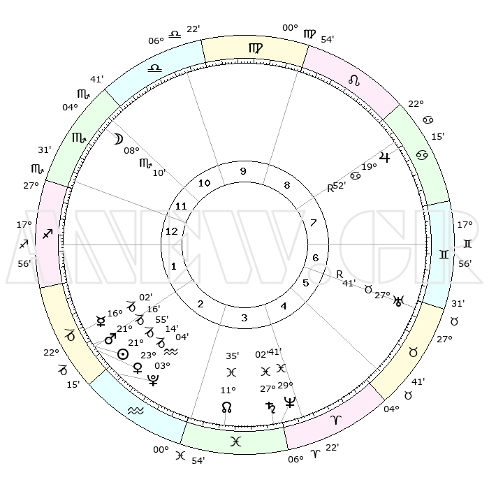 | | ΘΕΣΕΙΣ ΠΛΑΝΗΤΩΝ ΑΣΤΡΟΛΟΓΙΚΟΥ ΧΑΡΤΗ ΤΗΣ ΣΤΙΓΜΗΣ ΑΥΤΗΣ | | | | Πλανήτης | Ζώδιο | Μοίρες | Δεκαήμ. | Σε οίκο | Απόκλιση | | Ακμές των οίκων | | Ηλιος | Αιγόκερως | 21°52' | Τρίτο | 2 | 21 S 39 | | 1ος | 29°51' | Σκορπιός | | Σελήνη | Σκορπιός | 07°27' | Πρώτο | 11 | 18 S 04 | | 2ος | 00°58' | Αιγόκερως | | Ερμής | Αιγόκερως | 15°57' | Δεύτερο | 2 | 24 S 04 | | 3ος | 06°39' | Υδροχόος | | Αφροδίτη | Αιγόκερως | 23°09' | Τρίτο | 2 | 22 S 19 | | 4ος | 12°41' | Ιχθείς | | Αρης | Αιγόκερως | 21°14' | Τρίτο | 2 | 22 S 42 | | 5ος | 13°45' | Κριός | | Δίας | Καρκίνος | 19°52'R | Δεύτερο | 8 | 22 N 13 | | 6ος | 08°49' | Ταύρος | | Κρόνος | Ιχθείς | 27°01' | Τρίτο | 4 | 03 S 14 | | 7ος | 29°51' | Ταύρος | | Ουρανός | Ταύρος | 27°41'R | Τρίτο | 6 | 19 N 27 | | 8ος | 00°58' | Καρκίνος | | Ποσειδώνας | Ιχθείς | 29°41' | Τρίτο | 4 | 01 S 21 | | 9ος | 06°39' | Λέων | | Πλούτωνας | Υδροχόος | 03°04' | Πρώτο | 2 | 23 S 09 | | 10ος | 12°41' | Παρθένος | | Β. Δεσμός | Ιχθείς | 11°35' | Δεύτερο | 3 | 07 S 13 | | 11ος | 13°45' | Ζυγός | | Ωροσκόπος | Σκορπιός | 29°51' | Τρίτο | | | 12ος | 08°49' | Σκορπιός | | Μεσουράνημα | Παρθένος | 12°41' | Δεύτερο | | | |