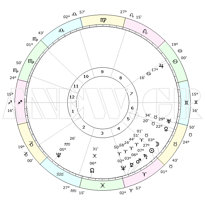 | | ΘΕΣΕΙΣ ΠΛΑΝΗΤΩΝ ΑΣΤΡΟΛΟΓΙΚΟΥ ΧΑΡΤΗ ΤΗΣ ΣΤΙΓΜΗΣ ΑΥΤΗΣ | | | | Πλανήτης | Ζώδιο | Μοίρες | Δεκαήμ. | Σε οίκο | Απόκλιση | | Ακμές των οίκων | | Ηλιος | Κριός | 27°48' | Τρίτο | 5 | 10 N 41 | | 1ος | 25°18' | Σκορπιός | | Σελήνη | Ταύρος | 02°02' | Πρώτο | 5 | 16 N 04 | | 2ος | 25°49' | Τοξότης | | Ερμής | Κριός | 03°52' | Πρώτο | 4 | 00 S 53 | | 3ος | 00°46' | Υδροχόος | | Αφροδίτη | Ταύρος | 22°15' | Τρίτο | 6 | 18 N 37 | | 4ος | 06°39' | Ιχθείς | | Αρης | Κριός | 06°13' | Πρώτο | 4 | 01 N 35 | | 5ος | 08°13' | Κριός | | Δίας | Καρκίνος | 17°16' | Δεύτερο | 8 | 22 N 42 | | 6ος | 03°55' | Ταύρος | | Κρόνος | Κριός | 07°43' | Πρώτο | 4 | 01 N 05 | | 7ος | 25°18' | Ταύρος | | Ουρανός | Ταύρος | 29°34' | Τρίτο | 7 | 19 N 53 | | 8ος | 25°49' | Δίδυμοι | | Ποσειδώνας | Κριός | 02°49' | Πρώτο | 4 | 00 S 05 | | 9ος | 00°46' | Λέων | | Πλούτωνας | Υδροχόος | 05°26' | Πρώτο | 3 | 22 S 47 | | 10ος | 06°39' | Παρθένος | | Β. Δεσμός | Ιχθείς | 06°31' | Πρώτο | 3 | 09 S 07 | | 11ος | 08°13' | Ζυγός | | Ωροσκόπος | Σκορπιός | 25°18' | Τρίτο | | | 12ος | 03°55' | Σκορπιός | | Μεσουράνημα | Παρθένος | 06°39' | Πρώτο | | | |
