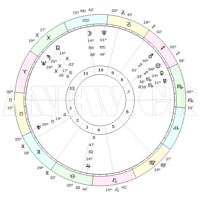 | | ΘΕΣΕΙΣ ΠΛΑΝΗΤΩΝ ΑΣΤΡΟΛΟΓΙΚΟΥ ΧΑΡΤΗ ΤΗΣ ΣΤΙΓΜΗΣ ΑΥΤΗΣ | | | | Πλανήτης | Ζώδιο | Μοίρες | Δεκαήμ. | Σε οίκο | Απόκλιση | | Ακμές των οίκων | | Ηλιος | Τοξότης | 04°32' | Πρώτο | 8 | 21 S 02 | | 1ος | 27°45' | Κριός | | Σελήνη | Υδροχόος | 13°58' | Δεύτερο | 11 | 19 S 05 | | 2ος | 00°36' | Δίδυμοι | | Ερμής | Σκορπιός | 21°40'R | Τρίτο | 7 | 16 S 04 | | 3ος | 24°23' | Δίδυμοι | | Αφροδίτη | Σκορπιός | 24°37' | Τρίτο | 7 | 18 S 05 | | 4ος | 16°04' | Καρκίνος | | Αρης | Τοξότης | 16°01' | Δεύτερο | 8 | 23 S 19 | | 5ος | 10°15' | Λέων | | Δίας | Καρκίνος | 24°47'R | Τρίτο | 4 | 21 N 19 | | 6ος | 12°32' | Παρθένος | | Κρόνος | Ιχθείς | 25°17'R | Τρίτο | 12 | 04 S 04 | | 7ος | 27°45' | Ζυγός | | Ουρανός | Ταύρος | 29°14'R | Τρίτο | 1 | 19 N 47 | | 8ος | 00°36' | Τοξότης | | Ποσειδώνας | Ιχθείς | 29°26'R | Τρίτο | 12 | 01 S 28 | | 9ος | 24°23' | Τοξότης | | Πλούτωνας | Υδροχόος | 01°49' | Πρώτο | 10 | 23 S 25 | | 10ος | 16°04' | Αιγόκερως | | Β. Δεσμός | Ιχθείς | 14°03' | Δεύτερο | 12 | 06 S 17 | | 11ος | 10°15' | Υδροχόος | | Ωροσκόπος | Κριός | 27°45' | Τρίτο | | | 12ος | 12°32' | Ιχθείς | | Μεσουράνημα | Αιγόκερως | 16°04' | Δεύτερο | | | |