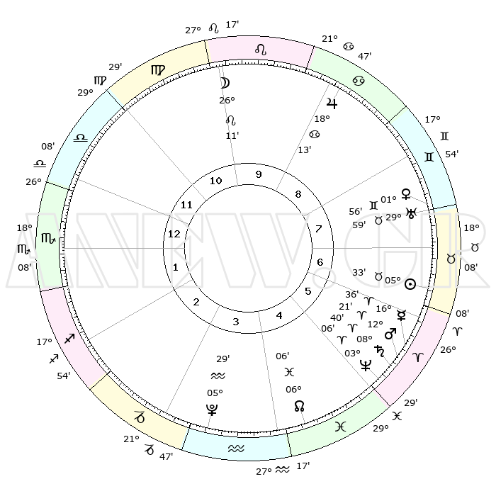 | | ΘΕΣΕΙΣ ΠΛΑΝΗΤΩΝ ΑΣΤΡΟΛΟΓΙΚΟΥ ΧΑΡΤΗ ΤΗΣ ΣΤΙΓΜΗΣ ΑΥΤΗΣ | | | | Πλανήτης | Ζώδιο | Μοίρες | Δεκαήμ. | Σε οίκο | Απόκλιση | | Ακμές των οίκων | | Ηλιος | Ταύρος | 05°29' | Πρώτο | 7 | 13 N 21 | | 1ος | 28°36' | Ζυγός | | Σελήνη | Λέων | 25°18' | Τρίτο | 10 | 14 N 05 | | 2ος | 26°56' | Σκορπιός | | Ερμής | Κριός | 16°29' | Δεύτερο | 6 | 04 N 16 | | 3ος | 28°47' | Τοξότης | | Αφροδίτη | Δίδυμοι | 01°51' | Πρώτο | 8 | 21 N 11 | | 4ος | 02°53' | Υδροχόος | | Αρης | Κριός | 12°18' | Δεύτερο | 6 | 04 N 01 | | 5ος | 05°48' | Ιχθείς | | Δίας | Καρκίνος | 18°12' | Δεύτερο | 9 | 22 N 35 | | 6ος | 04°36' | Κριός | | Κρόνος | Κριός | 08°39' | Πρώτο | 6 | 01 N 27 | | 7ος | 28°36' | Κριός | | Ουρανός | Ταύρος | 29°59' | Τρίτο | 8 | 19 N 59 | | 8ος | 26°56' | Ταύρος | | Ποσειδώνας | Κριός | 03°06' | Πρώτο | 5 | 00 N 01 | | 9ος | 28°47' | Δίδυμοι | | Πλούτωνας | Υδροχόος | 05°29' | Πρώτο | 4 | 22 S 48 | | 10ος | 02°53' | Λέων | | Β. Δεσμός | Ιχθείς | 06°06' | Πρώτο | 5 | 09 S 16 | | 11ος | 05°48' | Παρθένος | | Ωροσκόπος | Ζυγός | 28°36' | Τρίτο | | | 12ος | 04°36' | Ζυγός | | Μεσουράνημα | Λέων | 02°53' | Πρώτο | | | |