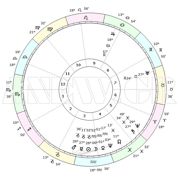 | | ΘΕΣΕΙΣ ΠΛΑΝΗΤΩΝ ΑΣΤΡΟΛΟΓΙΚΟΥ ΧΑΡΤΗ ΤΗΣ ΣΤΙΓΜΗΣ ΑΥΤΗΣ | | | | Πλανήτης | Ζώδιο | Μοίρες | Δεκαήμ. | Σε οίκο | Απόκλιση | | Ακμές των οίκων | | Ηλιος | Αιγόκερως | 28°51' | Τρίτο | 4 | 20 S 23 | | 1ος | 22°39' | Ζυγός | | Σελήνη | Υδροχόος | 00°03' | Πρώτο | 4 | 23 S 20 | | 2ος | 20°38' | Σκορπιός | | Ερμής | Αιγόκερως | 27°05' | Τρίτο | 4 | 22 S 40 | | 3ος | 22°05' | Τοξότης | | Αφροδίτη | Υδροχόος | 01°46' | Πρώτο | 4 | 20 S 49 | | 4ος | 25°49' | Αιγόκερως | | Αρης | Αιγόκερως | 26°33' | Τρίτο | 4 | 21 S 49 | | 5ος | 28°46' | Υδροχόος | | Δίας | Καρκίνος | 18°57'R | Δεύτερο | 9 | 22 N 22 | | 6ος | 28°02' | Ιχθείς | | Κρόνος | Ιχθείς | 27°34' | Τρίτο | 5 | 03 S 00 | | 7ος | 22°39' | Κριός | | Ουρανός | Ταύρος | 27°34'R | Τρίτο | 8 | 19 N 26 | | 8ος | 20°38' | Ταύρος | | Ποσειδώνας | Ιχθείς | 29°49' | Τρίτο | 6 | 01 S 17 | | 9ος | 22°05' | Δίδυμοι | | Πλούτωνας | Υδροχόος | 03°17' | Πρώτο | 4 | 23 S 06 | | 10ος | 25°49' | Καρκίνος | | Β. Δεσμός | Ιχθείς | 11°13' | Δεύτερο | 5 | 07 S 21 | | 11ος | 28°46' | Λέων | | Ωροσκόπος | Ζυγός | 22°39' | Τρίτο | | | 12ος | 28°02' | Παρθένος | | Μεσουράνημα | Καρκίνος | 25°49' | Τρίτο | | | |