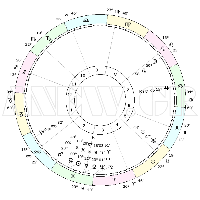 | | ΘΕΣΕΙΣ ΠΛΑΝΗΤΩΝ ΑΣΤΡΟΛΟΓΙΚΟΥ ΧΑΡΤΗ ΤΗΣ ΣΤΙΓΜΗΣ ΑΥΤΗΣ | | | | Πλανήτης | Ζώδιο | Μοίρες | Δεκαήμ. | Σε οίκο | Απόκλιση | | Ακμές των οίκων | | Ηλιος | Ιχθείς | 10°24' | Δεύτερο | 3 | 07 S 40 | | 1ος | 13°38' | Τοξότης | | Σελήνη | Λέων | 09°03' | Πρώτο | 8 | 20 N 32 | | 2ος | 17°02' | Αιγόκερως | | Ερμής | Ιχθείς | 21°59'R | Τρίτο | 3 | 00 S 09 | | 3ος | 25°02' | Υδροχόος | | Αφροδίτη | Ιχθείς | 23°13' | Τρίτο | 3 | 03 S 56 | | 4ος | 00°50' | Κριός | | Αρης | Υδροχόος | 28°45' | Τρίτο | 3 | 12 S 56 | | 5ος | 29°52' | Κριός | | Δίας | Καρκίνος | 15°15'R | Δεύτερο | 7 | 22 N 54 | | 6ος | 23°11' | Ταύρος | | Κρόνος | Κριός | 01°50' | Πρώτο | 4 | 01 S 14 | | 7ος | 13°38' | Δίδυμοι | | Ουρανός | Ταύρος | 27°44' | Τρίτο | 6 | 19 N 28 | | 8ος | 17°02' | Καρκίνος | | Ποσειδώνας | Κριός | 01°03' | Πρώτο | 4 | 00 S 47 | | 9ος | 25°02' | Λέων | | Πλούτωνας | Υδροχόος | 04°32' | Πρώτο | 2 | 22 S 52 | | 10ος | 00°50' | Ζυγός | | Β. Δεσμός | Ιχθείς | 09°03' | Πρώτο | 3 | 08 S 11 | | 11ος | 29°52' | Ζυγός | | Ωροσκόπος | Τοξότης | 13°38' | Δεύτερο | | | 12ος | 23°11' | Σκορπιός | | Μεσουράνημα | Ζυγός | 00°50' | Πρώτο | | | |