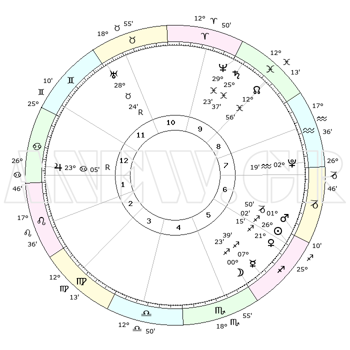| | ΘΕΣΕΙΣ ΠΛΑΝΗΤΩΝ ΑΣΤΡΟΛΟΓΙΚΟΥ ΧΑΡΤΗ ΤΗΣ ΣΤΙΓΜΗΣ ΑΥΤΗΣ | | | | Πλανήτης | Ζώδιο | Μοίρες | Δεκαήμ. | Σε οίκο | Απόκλιση | | Ακμές των οίκων | | Ηλιος | Τοξότης | 25°57' | Τρίτο | 6 | 23 S 22 | | 1ος | 03°36' | Καρκίνος | | Σελήνη | Σκορπιός | 29°29' | Τρίτο | 6 | 24 S 48 | | 2ος | 24°12' | Καρκίνος | | Ερμής | Τοξότης | 07°33' | Πρώτο | 6 | 20 S 23 | | 3ος | 16°16' | Λέων | | Αφροδίτη | Τοξότης | 21°09' | Τρίτο | 6 | 23 S 05 | | 4ος | 13°10' | Παρθένος | | Αρης | Αιγόκερως | 01°46' | Πρώτο | 6 | 24 S 13 | | 5ος | 17°38' | Ζυγός | | Δίας | Καρκίνος | 23°05'R | Τρίτο | 1 | 21 N 39 | | 6ος | 27°20' | Σκορπιός | | Κρόνος | Ιχθείς | 25°37' | Τρίτο | 10 | 03 S 52 | | 7ος | 03°36' | Αιγόκερως | | Ουρανός | Ταύρος | 28°24'R | Τρίτο | 12 | 19 N 36 | | 8ος | 24°12' | Αιγόκερως | | Ποσειδώνας | Ιχθείς | 29°23' | Τρίτο | 10 | 01 S 29 | | 9ος | 16°16' | Υδροχόος | | Πλούτωνας | Υδροχόος | 02°19' | Πρώτο | 8 | 23 S 18 | | 10ος | 13°10' | Ιχθείς | | Β. Δεσμός | Ιχθείς | 12°56' | Δεύτερο | 9 | 06 S 42 | | 11ος | 17°38' | Κριός | | Ωροσκόπος | Καρκίνος | 03°36' | Πρώτο | | | 12ος | 27°20' | Ταύρος | | Μεσουράνημα | Ιχθείς | 13°10' | Δεύτερο | | | |