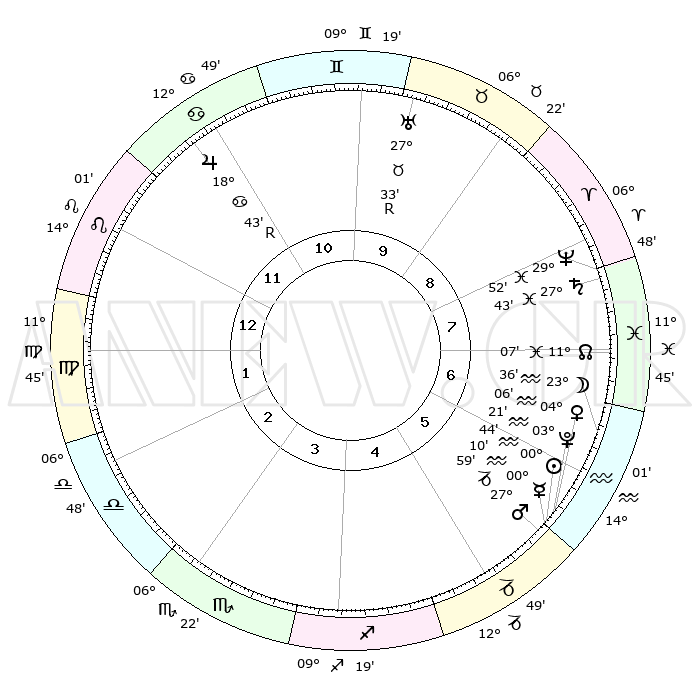 | | ΘΕΣΕΙΣ ΠΛΑΝΗΤΩΝ ΑΣΤΡΟΛΟΓΙΚΟΥ ΧΑΡΤΗ ΤΗΣ ΣΤΙΓΜΗΣ ΑΥΤΗΣ | | | | Πλανήτης | Ζώδιο | Μοίρες | Δεκαήμ. | Σε οίκο | Απόκλιση | | Ακμές των οίκων | | Ηλιος | Υδροχόος | 00°38' | Πρώτο | 6 | 20 S 01 | | 1ος | 13°05' | Λέων | | Σελήνη | Υδροχόος | 22°20' | Τρίτο | 7 | 15 S 30 | | 2ος | 05°12' | Παρθένος | | Ερμής | Υδροχόος | 00°00' | Πρώτο | 6 | 22 S 08 | | 3ος | 01°59' | Ζυγός | | Αφροδίτη | Υδροχόος | 03°59' | Πρώτο | 6 | 20 S 21 | | 4ος | 04°17' | Σκορπιός | | Αρης | Αιγόκερως | 27°54' | Τρίτο | 6 | 21 S 33 | | 5ος | 09°42' | Τοξότης | | Δίας | Καρκίνος | 18°44'R | Δεύτερο | 12 | 22 N 24 | | 6ος | 13°26' | Αιγόκερως | | Κρόνος | Ιχθείς | 27°43' | Τρίτο | 8 | 02 S 56 | | 7ος | 13°05' | Υδροχόος | | Ουρανός | Ταύρος | 27°33'R | Τρίτο | 10 | 19 N 25 | | 8ος | 05°12' | Ιχθείς | | Ποσειδώνας | Ιχθείς | 29°51' | Τρίτο | 8 | 01 S 16 | | 9ος | 01°59' | Κριός | | Πλούτωνας | Υδροχόος | 03°20' | Πρώτο | 6 | 23 S 06 | | 10ος | 04°17' | Ταύρος | | Β. Δεσμός | Ιχθείς | 11°08' | Δεύτερο | 8 | 07 S 23 | | 11ος | 09°42' | Δίδυμοι | | Ωροσκόπος | Λέων | 13°05' | Δεύτερο | | | 12ος | 13°26' | Καρκίνος | | Μεσουράνημα | Ταύρος | 04°17' | Πρώτο | | | |