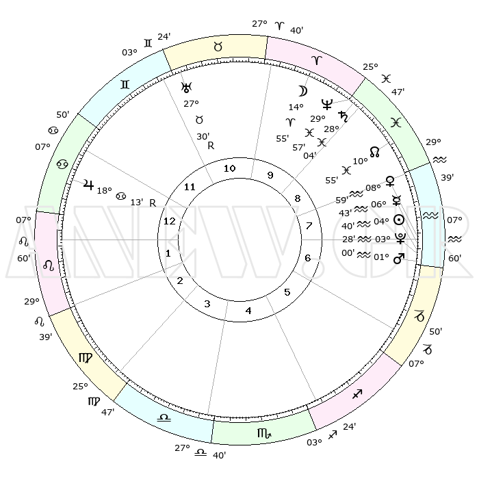 | | ΘΕΣΕΙΣ ΠΛΑΝΗΤΩΝ ΑΣΤΡΟΛΟΓΙΚΟΥ ΧΑΡΤΗ ΤΗΣ ΣΤΙΓΜΗΣ ΑΥΤΗΣ | | | | Πλανήτης | Ζώδιο | Μοίρες | Δεκαήμ. | Σε οίκο | Απόκλιση | | Ακμές των οίκων | | Ηλιος | Υδροχόος | 04°36' | Πρώτο | 7 | 19 S 06 | | 1ος | 15°39' | Καρκίνος | | Σελήνη | Κριός | 13°53' | Δεύτερο | 10 | 08 N 12 | | 2ος | 06°05' | Λέων | | Ερμής | Υδροχόος | 06°35' | Πρώτο | 8 | 20 S 39 | | 3ος | 29°19' | Λέων | | Αφροδίτη | Υδροχόος | 08°53' | Πρώτο | 8 | 19 S 13 | | 4ος | 28°13' | Παρθένος | | Αρης | Υδροχόος | 00°57' | Πρώτο | 7 | 20 S 56 | | 5ος | 03°59' | Σκορπιός | | Δίας | Καρκίνος | 18°14'R | Δεύτερο | 1 | 22 N 29 | | 6ος | 12°05' | Τοξότης | | Κρόνος | Ιχθείς | 28°03' | Τρίτο | 9 | 02 S 47 | | 7ος | 15°39' | Αιγόκερως | | Ουρανός | Ταύρος | 27°30'R | Τρίτο | 11 | 19 N 25 | | 8ος | 06°05' | Υδροχόος | | Ποσειδώνας | Ιχθείς | 29°57' | Τρίτο | 10 | 01 S 14 | | 9ος | 29°19' | Υδροχόος | | Πλούτωνας | Υδροχόος | 03°28' | Πρώτο | 7 | 23 S 04 | | 10ος | 28°13' | Ιχθείς | | Β. Δεσμός | Ιχθείς | 10°55' | Δεύτερο | 9 | 07 S 28 | | 11ος | 03°59' | Ταύρος | | Ωροσκόπος | Καρκίνος | 15°39' | Δεύτερο | | | 12ος | 12°05' | Δίδυμοι | | Μεσουράνημα | Ιχθείς | 28°13' | Τρίτο | | | |
