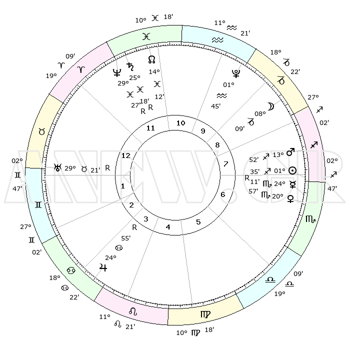 | | ΘΕΣΕΙΣ ΠΛΑΝΗΤΩΝ ΑΣΤΡΟΛΟΓΙΚΟΥ ΧΑΡΤΗ ΤΗΣ ΣΤΙΓΜΗΣ ΑΥΤΗΣ | | | | Πλανήτης | Ζώδιο | Μοίρες | Δεκαήμ. | Σε οίκο | Απόκλιση | | Ακμές των οίκων | | Ηλιος | Τοξότης | 01°30' | Πρώτο | 8 | 20 S 27 | | 1ος | 28°12' | Κριός | | Σελήνη | Αιγόκερως | 07°16' | Πρώτο | 9 | 27 S 51 | | 2ος | 00°55' | Δίδυμοι | | Ερμής | Σκορπιός | 24°16'R | Τρίτο | 7 | 17 S 21 | | 3ος | 24°40' | Δίδυμοι | | Αφροδίτη | Σκορπιός | 20°51' | Τρίτο | 7 | 17 S 02 | | 4ος | 16°21' | Καρκίνος | | Αρης | Τοξότης | 13°49' | Δεύτερο | 8 | 23 S 03 | | 5ος | 10°35' | Λέων | | Δίας | Καρκίνος | 24°55'R | Τρίτο | 4 | 21 N 17 | | 6ος | 12°56' | Παρθένος | | Κρόνος | Ιχθείς | 25°18'R | Τρίτο | 12 | 04 S 04 | | 7ος | 28°12' | Ζυγός | | Ουρανός | Ταύρος | 29°21'R | Τρίτο | 1 | 19 N 48 | | 8ος | 00°56' | Τοξότης | | Ποσειδώνας | Ιχθείς | 29°27'R | Τρίτο | 12 | 01 S 28 | | 9ος | 24°40' | Τοξότης | | Πλούτωνας | Υδροχόος | 01°45' | Πρώτο | 10 | 23 S 26 | | 10ος | 16°21' | Αιγόκερως | | Β. Δεσμός | Ιχθείς | 14°12' | Δεύτερο | 12 | 06 S 13 | | 11ος | 10°35' | Υδροχόος | | Ωροσκόπος | Κριός | 28°12' | Τρίτο | | | 12ος | 12°56' | Ιχθείς | | Μεσουράνημα | Αιγόκερως | 16°21' | Δεύτερο | | | |
