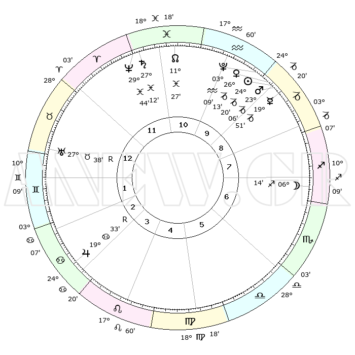 | | ΘΕΣΕΙΣ ΠΛΑΝΗΤΩΝ ΑΣΤΡΟΛΟΓΙΚΟΥ ΧΑΡΤΗ ΤΗΣ ΣΤΙΓΜΗΣ ΑΥΤΗΣ | | | | Πλανήτης | Ζώδιο | Μοίρες | Δεκαήμ. | Σε οίκο | Απόκλιση | | Ακμές των οίκων | | Ηλιος | Αιγόκερως | 24°15' | Τρίτο | 10 | 21 S 15 | | 1ος | 03°35' | Ταύρος | | Σελήνη | Τοξότης | 05°17' | Πρώτο | 8 | 26 S 12 | | 2ος | 04°49' | Δίδυμοι | | Ερμής | Αιγόκερως | 19°43' | Δεύτερο | 9 | 23 S 43 | | 3ος | 28°01' | Δίδυμοι | | Αφροδίτη | Αιγόκερως | 26°07' | Τρίτο | 10 | 21 S 52 | | 4ος | 19°44' | Καρκίνος | | Αρης | Αιγόκερως | 23°03' | Τρίτο | 10 | 22 S 25 | | 5ος | 14°30' | Λέων | | Δίας | Καρκίνος | 19°33'R | Δεύτερο | 3 | 22 N 16 | | 6ος | 17°56' | Παρθένος | | Κρόνος | Ιχθείς | 27°12' | Τρίτο | 12 | 03 S 09 | | 7ος | 03°35' | Σκορπιός | | Ουρανός | Ταύρος | 27°38'R | Τρίτο | 1 | 19 N 26 | | 8ος | 04°49' | Τοξότης | | Ποσειδώνας | Ιχθείς | 29°44' | Τρίτο | 12 | 01 S 20 | | 9ος | 28°01' | Τοξότης | | Πλούτωνας | Υδροχόος | 03°08' | Πρώτο | 10 | 23 S 08 | | 10ος | 19°44' | Αιγόκερως | | Β. Δεσμός | Ιχθείς | 11°27' | Δεύτερο | 11 | 07 S 16 | | 11ος | 14°30' | Υδροχόος | | Ωροσκόπος | Ταύρος | 03°35' | Πρώτο | | | 12ος | 17°56' | Ιχθείς | | Μεσουράνημα | Αιγόκερως | 19°44' | Δεύτερο | | | |