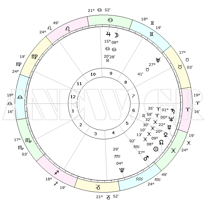 | | ΘΕΣΕΙΣ ΠΛΑΝΗΤΩΝ ΑΣΤΡΟΛΟΓΙΚΟΥ ΧΑΡΤΗ ΤΗΣ ΣΤΙΓΜΗΣ ΑΥΤΗΣ | | | | Πλανήτης | Ζώδιο | Μοίρες | Δεκαήμ. | Σε οίκο | Απόκλιση | | Ακμές των οίκων | | Ηλιος | Ιχθείς | 08°09' | Πρώτο | 6 | 08 S 31 | | 1ος | 01°04' | Ζυγός | | Σελήνη | Καρκίνος | 07°36' | Πρώτο | 10 | 27 N 51 | | 2ος | 27°44' | Ζυγός | | Ερμής | Ιχθείς | 22°33'R | Τρίτο | 6 | 00 S 18 | | 3ος | 28°13' | Σκορπιός | | Αφροδίτη | Ιχθείς | 20°25' | Τρίτο | 6 | 05 S 04 | | 4ος | 01°12' | Αιγόκερως | | Αρης | Υδροχόος | 26°59' | Τρίτο | 5 | 13 S 33 | | 5ος | 04°10' | Υδροχόος | | Δίας | Καρκίνος | 15°20'R | Δεύτερο | 10 | 22 N 53 | | 6ος | 04°34' | Ιχθείς | | Κρόνος | Κριός | 01°34' | Πρώτο | 7 | 01 S 20 | | 7ος | 01°04' | Κριός | | Ουρανός | Ταύρος | 27°41' | Τρίτο | 8 | 19 N 28 | | 8ος | 27°44' | Κριός | | Ποσειδώνας | Κριός | 00°58' | Πρώτο | 6 | 00 S 49 | | 9ος | 28°13' | Ταύρος | | Πλούτωνας | Υδροχόος | 04°29' | Πρώτο | 5 | 22 S 53 | | 10ος | 01°12' | Καρκίνος | | Β. Δεσμός | Ιχθείς | 09°10' | Πρώτο | 6 | 08 S 08 | | 11ος | 04°10' | Λέων | | Ωροσκόπος | Ζυγός | 01°04' | Πρώτο | | | 12ος | 04°34' | Παρθένος | | Μεσουράνημα | Καρκίνος | 01°12' | Πρώτο | | | |