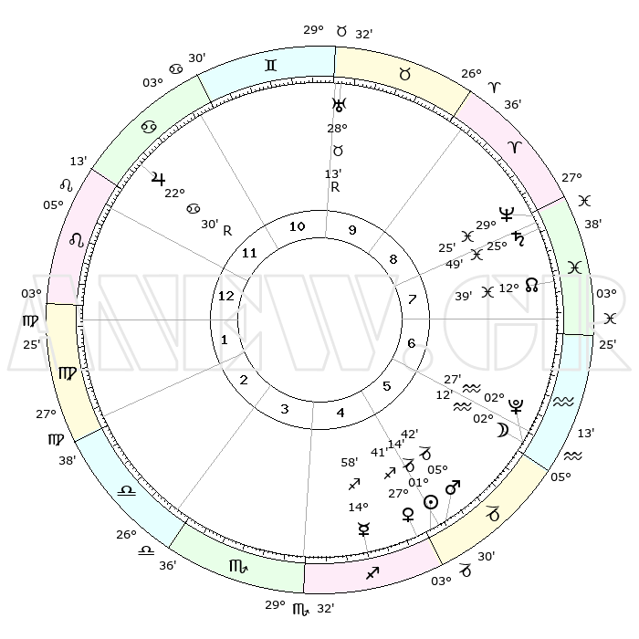 | | ΘΕΣΕΙΣ ΠΛΑΝΗΤΩΝ ΑΣΤΡΟΛΟΓΙΚΟΥ ΧΑΡΤΗ ΤΗΣ ΣΤΙΓΜΗΣ ΑΥΤΗΣ | | | | Πλανήτης | Ζώδιο | Μοίρες | Δεκαήμ. | Σε οίκο | Απόκλιση | | Ακμές των οίκων | | Ηλιος | Αιγόκερως | 01°09' | Πρώτο | 5 | 23 S 26 | | 1ος | 10°52' | Λέων | | Σελήνη | Υδροχόος | 01°14' | Πρώτο | 6 | 23 S 03 | | 2ος | 02°46' | Παρθένος | | Ερμής | Τοξότης | 14°51' | Δεύτερο | 5 | 22 S 02 | | 3ος | 29°17' | Παρθένος | | Αφροδίτη | Τοξότης | 27°35' | Τρίτο | 5 | 23 S 33 | | 4ος | 01°25' | Σκορπιός | | Αρης | Αιγόκερως | 05°39' | Πρώτο | 5 | 24 S 09 | | 5ος | 06°58' | Τοξότης | | Δίας | Καρκίνος | 22°30'R | Τρίτο | 12 | 21 N 46 | | 6ος | 11°00' | Αιγόκερως | | Κρόνος | Ιχθείς | 25°49' | Τρίτο | 8 | 03 S 46 | | 7ος | 10°52' | Υδροχόος | | Ουρανός | Ταύρος | 28°13'R | Τρίτο | 10 | 19 N 34 | | 8ος | 02°46' | Ιχθείς | | Ποσειδώνας | Ιχθείς | 29°25' | Τρίτο | 9 | 01 S 28 | | 9ος | 29°17' | Ιχθείς | | Πλούτωνας | Υδροχόος | 02°27' | Πρώτο | 6 | 23 S 17 | | 10ος | 01°25' | Ταύρος | | Β. Δεσμός | Ιχθείς | 12°39' | Δεύτερο | 8 | 06 S 48 | | 11ος | 06°58' | Δίδυμοι | | Ωροσκόπος | Λέων | 10°52' | Δεύτερο | | | 12ος | 11°00' | Καρκίνος | | Μεσουράνημα | Ταύρος | 01°25' | Πρώτο | | | |