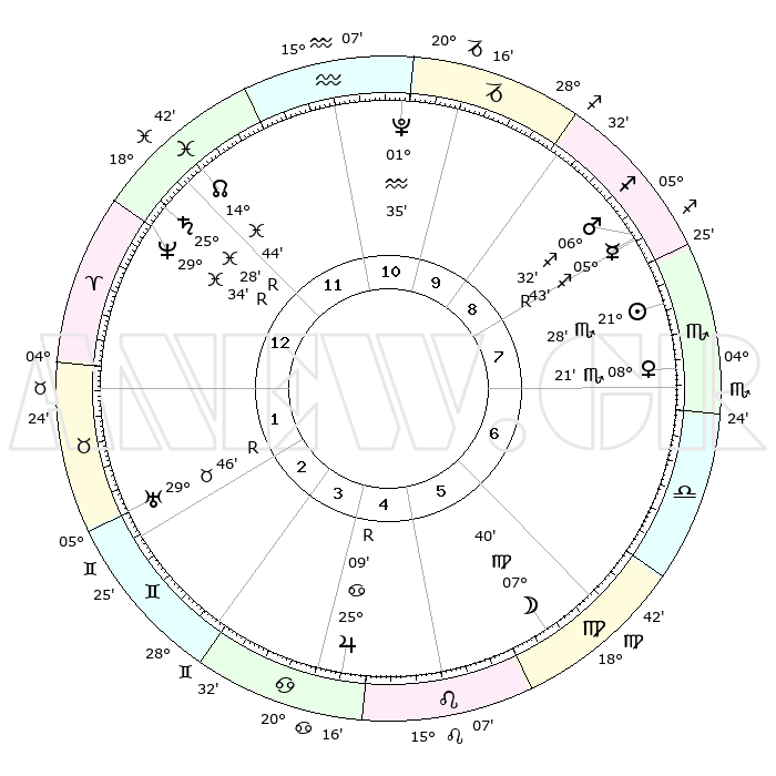 | | ΘΕΣΕΙΣ ΠΛΑΝΗΤΩΝ ΑΣΤΡΟΛΟΓΙΚΟΥ ΧΑΡΤΗ ΤΗΣ ΣΤΙΓΜΗΣ ΑΥΤΗΣ | | | | Πλανήτης | Ζώδιο | Μοίρες | Δεκαήμ. | Σε οίκο | Απόκλιση | | Ακμές των οίκων | | Ηλιος | Σκορπιός | 21°24' | Τρίτο | 8 | 18 S 06 | | 1ος | 27°43' | Ιχθείς | | Σελήνη | Παρθένος | 06°52' | Πρώτο | 6 | 09 N 45 | | 2ος | 08°33' | Ταύρος | | Ερμής | Τοξότης | 05°45'R | Πρώτο | 8 | 22 S 51 | | 3ος | 06°18' | Δίδυμοι | | Αφροδίτη | Σκορπιός | 08°16' | Πρώτο | 7 | 13 S 05 | | 4ος | 28°43' | Δίδυμοι | | Αρης | Τοξότης | 06°29' | Πρώτο | 9 | 21 S 53 | | 5ος | 20°55' | Καρκίνος | | Δίας | Καρκίνος | 25°09'R | Τρίτο | 5 | 21 N 13 | | 6ος | 17°59' | Λέων | | Κρόνος | Ιχθείς | 25°28'R | Τρίτο | 12 | 04 S 02 | | 7ος | 27°43' | Παρθένος | | Ουρανός | Ταύρος | 29°46'R | Τρίτο | 2 | 19 N 54 | | 8ος | 08°33' | Σκορπιός | | Ποσειδώνας | Ιχθείς | 29°34'R | Τρίτο | 1 | 01 S 25 | | 9ος | 06°18' | Τοξότης | | Πλούτωνας | Υδροχόος | 01°35' | Πρώτο | 11 | 23 S 29 | | 10ος | 28°43' | Τοξότης | | Β. Δεσμός | Ιχθείς | 14°44' | Δεύτερο | 12 | 06 S 01 | | 11ος | 20°55' | Αιγόκερως | | Ωροσκόπος | Ιχθείς | 27°43' | Τρίτο | | | 12ος | 17°59' | Υδροχόος | | Μεσουράνημα | Τοξότης | 28°43' | Τρίτο | | | |