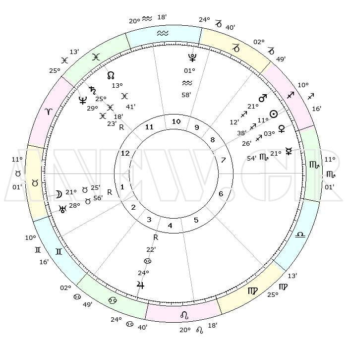 | | ΘΕΣΕΙΣ ΠΛΑΝΗΤΩΝ ΑΣΤΡΟΛΟΓΙΚΟΥ ΧΑΡΤΗ ΤΗΣ ΣΤΙΓΜΗΣ ΑΥΤΗΣ | | | | Πλανήτης | Ζώδιο | Μοίρες | Δεκαήμ. | Σε οίκο | Απόκλιση | | Ακμές των οίκων | | Ηλιος | Τοξότης | 11°36' | Δεύτερο | 8 | 22 S 10 | | 1ος | 24°54' | Κριός | | Σελήνη | Ταύρος | 20°58' | Τρίτο | 1 | 22 N 26 | | 2ος | 28°32' | Ταύρος | | Ερμής | Σκορπιός | 21°53' | Τρίτο | 7 | 15 S 43 | | 3ος | 22°38' | Δίδυμοι | | Αφροδίτη | Τοξότης | 03°23' | Πρώτο | 8 | 20 S 14 | | 4ος | 14°20' | Καρκίνος | | Αρης | Τοξότης | 21°11' | Τρίτο | 8 | 23 S 49 | | 5ος | 08°15' | Λέων | | Δίας | Καρκίνος | 24°22'R | Τρίτο | 4 | 21 N 24 | | 6ος | 09°58' | Παρθένος | | Κρόνος | Ιχθείς | 25°18' | Τρίτο | 12 | 04 S 02 | | 7ος | 24°54' | Ζυγός | | Ουρανός | Ταύρος | 28°57'R | Τρίτο | 2 | 19 N 43 | | 8ος | 28°32' | Σκορπιός | | Ποσειδώνας | Ιχθείς | 29°23'R | Τρίτο | 12 | 01 S 29 | | 9ος | 22°38' | Τοξότης | | Πλούτωνας | Υδροχόος | 01°58' | Πρώτο | 10 | 23 S 23 | | 10ος | 14°20' | Αιγόκερως | | Β. Δεσμός | Ιχθείς | 13°41' | Δεύτερο | 12 | 06 S 25 | | 11ος | 08°15' | Υδροχόος | | Ωροσκόπος | Κριός | 24°54' | Τρίτο | | | 12ος | 09°58' | Ιχθείς | | Μεσουράνημα | Αιγόκερως | 14°20' | Δεύτερο | | | |