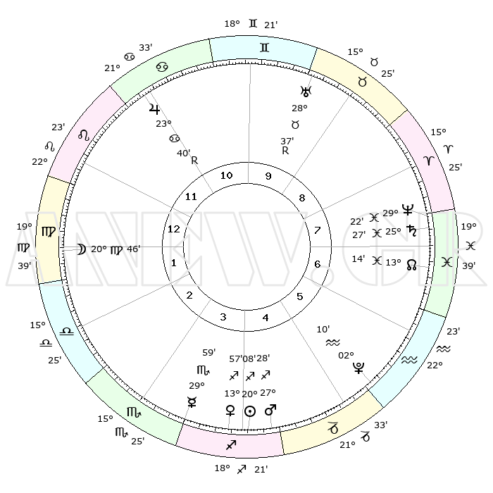 | | ΘΕΣΕΙΣ ΠΛΑΝΗΤΩΝ ΑΣΤΡΟΛΟΓΙΚΟΥ ΧΑΡΤΗ ΤΗΣ ΣΤΙΓΜΗΣ ΑΥΤΗΣ | | | | Πλανήτης | Ζώδιο | Μοίρες | Δεκαήμ. | Σε οίκο | Απόκλιση | | Ακμές των οίκων | | Ηλιος | Τοξότης | 20°07' | Τρίτο | 4 | 23 S 04 | | 1ος | 16°60' | Παρθένος | | Σελήνη | Παρθένος | 20°40' | Τρίτο | 1 | 03 N 05 | | 2ος | 12°32' | Ζυγός | | Ερμής | Σκορπιός | 29°58' | Τρίτο | 3 | 18 S 16 | | 3ος | 12°24' | Σκορπιός | | Αφροδίτη | Τοξότης | 13°56' | Δεύτερο | 3 | 22 S 11 | | 4ος | 15°20' | Τοξότης | | Αρης | Τοξότης | 27°27' | Τρίτο | 4 | 24 S 10 | | 5ος | 18°37' | Αιγόκερως | | Δίας | Καρκίνος | 23°40'R | Τρίτο | 11 | 21 N 33 | | 6ος | 19°34' | Υδροχόος | | Κρόνος | Ιχθείς | 25°27' | Τρίτο | 7 | 03 S 57 | | 7ος | 16°60' | Ιχθείς | | Ουρανός | Ταύρος | 28°37'R | Τρίτο | 9 | 19 N 39 | | 8ος | 12°32' | Κριός | | Ποσειδώνας | Ιχθείς | 29°22' | Τρίτο | 7 | 01 S 29 | | 9ος | 12°24' | Ταύρος | | Πλούτωνας | Υδροχόος | 02°10' | Πρώτο | 5 | 23 S 20 | | 10ος | 15°20' | Δίδυμοι | | Β. Δεσμός | Ιχθείς | 13°14' | Δεύτερο | 6 | 06 S 35 | | 11ος | 18°37' | Καρκίνος | | Ωροσκόπος | Παρθένος | 16°60' | Δεύτερο | | | 12ος | 19°34' | Λέων | | Μεσουράνημα | Δίδυμοι | 15°20' | Δεύτερο | | | |