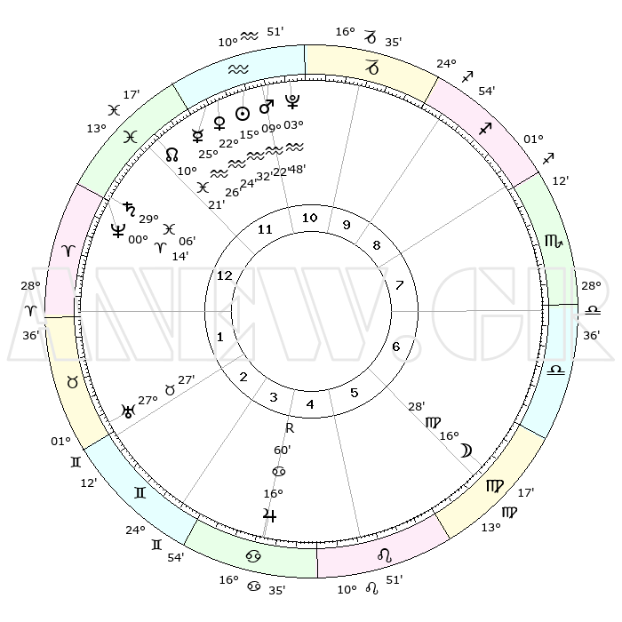 | | ΘΕΣΕΙΣ ΠΛΑΝΗΤΩΝ ΑΣΤΡΟΛΟΓΙΚΟΥ ΧΑΡΤΗ ΤΗΣ ΣΤΙΓΜΗΣ ΑΥΤΗΣ | | | | Πλανήτης | Ζώδιο | Μοίρες | Δεκαήμ. | Σε οίκο | Απόκλιση | | Ακμές των οίκων | | Ηλιος | Υδροχόος | 15°29' | Δεύτερο | 12 | 16 S 11 | | 1ος | 23°21' | Ιχθείς | | Σελήνη | Παρθένος | 15°39' | Δεύτερο | 6 | 05 N 06 | | 2ος | 05°10' | Ταύρος | | Ερμής | Υδροχόος | 25°20' | Τρίτο | 12 | 14 S 36 | | 3ος | 03°38' | Δίδυμοι | | Αφροδίτη | Υδροχόος | 22°20' | Τρίτο | 12 | 15 S 24 | | 4ος | 26°16' | Δίδυμοι | | Αρης | Υδροχόος | 09°19' | Πρώτο | 11 | 18 S 56 | | 5ος | 18°19' | Καρκίνος | | Δίας | Καρκίνος | 16°60'R | Δεύτερο | 4 | 22 N 40 | | 6ος | 14°44' | Λέων | | Κρόνος | Ιχθείς | 29°05' | Τρίτο | 1 | 02 S 21 | | 7ος | 23°21' | Παρθένος | | Ουρανός | Ταύρος | 27°27' | Τρίτο | 2 | 19 N 24 | | 8ος | 05°10' | Σκορπιός | | Ποσειδώνας | Κριός | 00°14' | Πρώτο | 1 | 01 S 07 | | 9ος | 03°38' | Τοξότης | | Πλούτωνας | Υδροχόος | 03°48' | Πρώτο | 11 | 23 S 00 | | 10ος | 26°16' | Τοξότης | | Β. Δεσμός | Ιχθείς | 10°21' | Δεύτερο | 12 | 07 S 41 | | 11ος | 18°19' | Αιγόκερως | | Ωροσκόπος | Ιχθείς | 23°21' | Τρίτο | | | 12ος | 14°44' | Υδροχόος | | Μεσουράνημα | Τοξότης | 26°16' | Τρίτο | | | |