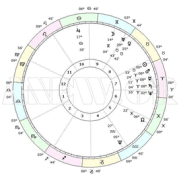 | | ΘΕΣΕΙΣ ΠΛΑΝΗΤΩΝ ΑΣΤΡΟΛΟΓΙΚΟΥ ΧΑΡΤΗ ΤΗΣ ΣΤΙΓΜΗΣ ΑΥΤΗΣ | | | | Πλανήτης | Ζώδιο | Μοίρες | Δεκαήμ. | Σε οίκο | Απόκλιση | | Ακμές των οίκων | | Ηλιος | Ταύρος | 00°30' | Πρώτο | 8 | 11 N 39 | | 1ος | 19°17' | Παρθένος | | Σελήνη | Δίδυμοι | 13°14' | Δεύτερο | 9 | 27 N 25 | | 2ος | 15°01' | Ζυγός | | Ερμής | Κριός | 08°05' | Πρώτο | 7 | 00 N 48 | | 3ος | 14°59' | Σκορπιός | | Αφροδίτη | Ταύρος | 25°38' | Τρίτο | 9 | 19 N 35 | | 4ος | 17°55' | Τοξότης | | Αρης | Κριός | 08°21' | Πρώτο | 7 | 02 N 26 | | 5ος | 21°07' | Αιγόκερως | | Δίας | Καρκίνος | 17°35' | Δεύτερο | 10 | 22 N 39 | | 6ος | 21°59' | Υδροχόος | | Κρόνος | Κριός | 08°03' | Πρώτο | 7 | 01 N 13 | | 7ος | 19°16' | Ιχθείς | | Ουρανός | Ταύρος | 29°43' | Τρίτο | 9 | 19 N 55 | | 8ος | 15°01' | Κριός | | Ποσειδώνας | Κριός | 02°55' | Πρώτο | 7 | 00 S 03 | | 9ος | 14°59' | Ταύρος | | Πλούτωνας | Υδροχόος | 05°27' | Πρώτο | 5 | 22 S 48 | | 10ος | 17°55' | Δίδυμοι | | Β. Δεσμός | Ιχθείς | 06°22' | Πρώτο | 6 | 09 S 10 | | 11ος | 21°07' | Καρκίνος | | Ωροσκόπος | Παρθένος | 19°17' | Δεύτερο | | | 12ος | 21°59' | Λέων | | Μεσουράνημα | Δίδυμοι | 17°55' | Δεύτερο | | | |