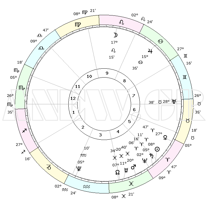 | | ΘΕΣΕΙΣ ΠΛΑΝΗΤΩΝ ΑΣΤΡΟΛΟΓΙΚΟΥ ΧΑΡΤΗ ΤΗΣ ΣΤΙΓΜΗΣ ΑΥΤΗΣ | | | | Πλανήτης | Ζώδιο | Μοίρες | Δεκαήμ. | Σε οίκο | Απόκλιση | | Ακμές των οίκων | | Ηλιος | Κριός | 08°06' | Πρώτο | 5 | 03 N 13 | | 1ος | 03°50' | Σκορπιός | | Σελήνη | Λέων | 16°12' | Δεύτερο | 10 | 17 N 54 | | 2ος | 02°29' | Τοξότης | | Ερμής | Ιχθείς | 11°17' | Δεύτερο | 4 | 08 S 02 | | 3ος | 04°46' | Αιγόκερως | | Αφροδίτη | Κριός | 27°41' | Τρίτο | 6 | 10 N 07 | | 4ος | 09°13' | Υδροχόος | | Αρης | Ιχθείς | 20°37' | Τρίτο | 5 | 04 S 41 | | 5ος | 12°05' | Ιχθείς | | Δίας | Καρκίνος | 15°35' | Δεύτερο | 9 | 22 N 53 | | 6ος | 10°23' | Κριός | | Κρόνος | Κριός | 05°16' | Πρώτο | 5 | 00 N 08 | | 7ος | 03°50' | Ταύρος | | Ουρανός | Ταύρος | 28°38' | Τρίτο | 7 | 19 N 41 | | 8ος | 02°29' | Δίδυμοι | | Ποσειδώνας | Κριός | 02°05' | Πρώτο | 5 | 00 S 22 | | 9ος | 04°46' | Καρκίνος | | Πλούτωνας | Υδροχόος | 05°10' | Πρώτο | 3 | 22 S 48 | | 10ος | 09°13' | Λέων | | Β. Δεσμός | Ιχθείς | 07°34' | Πρώτο | 4 | 08 S 44 | | 11ος | 12°05' | Παρθένος | | Ωροσκόπος | Σκορπιός | 03°50' | Πρώτο | | | 12ος | 10°23' | Ζυγός | | Μεσουράνημα | Λέων | 09°13' | Πρώτο | | | |