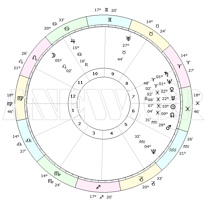 | | ΘΕΣΕΙΣ ΠΛΑΝΗΤΩΝ ΑΣΤΡΟΛΟΓΙΚΟΥ ΧΑΡΤΗ ΤΗΣ ΣΤΙΓΜΗΣ ΑΥΤΗΣ | | | | Πλανήτης | Ζώδιο | Μοίρες | Δεκαήμ. | Σε οίκο | Απόκλιση | | Ακμές των οίκων | | Ηλιος | Ιχθείς | 10°03' | Δεύτερο | 7 | 07 S 48 | | 1ος | 01°16' | Παρθένος | | Σελήνη | Λέων | 04°12' | Πρώτο | 12 | 22 N 08 | | 2ος | 25°15' | Παρθένος | | Ερμής | Ιχθείς | 22°07'R | Τρίτο | 7 | 00 S 09 | | 3ος | 24°02' | Ζυγός | | Αφροδίτη | Ιχθείς | 22°47' | Τρίτο | 7 | 04 S 07 | | 4ος | 26°58' | Σκορπιός | | Αρης | Υδροχόος | 28°29' | Τρίτο | 6 | 13 S 02 | | 5ος | 01°04' | Αιγόκερως | | Δίας | Καρκίνος | 15°16'R | Δεύτερο | 11 | 22 N 54 | | 6ος | 02°56' | Υδροχόος | | Κρόνος | Κριός | 01°48' | Πρώτο | 8 | 01 S 15 | | 7ος | 01°16' | Ιχθείς | | Ουρανός | Ταύρος | 27°44' | Τρίτο | 10 | 19 N 28 | | 8ος | 25°15' | Ιχθείς | | Ποσειδώνας | Κριός | 01°02' | Πρώτο | 8 | 00 S 47 | | 9ος | 24°02' | Κριός | | Πλούτωνας | Υδροχόος | 04°32' | Πρώτο | 6 | 22 S 53 | | 10ος | 26°58' | Ταύρος | | Β. Δεσμός | Ιχθείς | 09°04' | Πρώτο | 7 | 08 S 10 | | 11ος | 01°04' | Καρκίνος | | Ωροσκόπος | Παρθένος | 01°16' | Πρώτο | | | 12ος | 02°56' | Λέων | | Μεσουράνημα | Ταύρος | 26°58' | Τρίτο | | | |