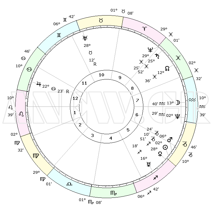 | | ΘΕΣΕΙΣ ΠΛΑΝΗΤΩΝ ΑΣΤΡΟΛΟΓΙΚΟΥ ΧΑΡΤΗ ΤΗΣ ΣΤΙΓΜΗΣ ΑΥΤΗΣ | | | | Πλανήτης | Ζώδιο | Μοίρες | Δεκαήμ. | Σε οίκο | Απόκλιση | | Ακμές των οίκων | | Ηλιος | Αιγόκερως | 02°06' | Πρώτο | 6 | 23 S 25 | | 1ος | 18°25' | Καρκίνος | | Σελήνη | Υδροχόος | 12°43' | Δεύτερο | 8 | 19 S 19 | | 2ος | 08°55' | Λέων | | Ερμής | Τοξότης | 16°12' | Δεύτερο | 6 | 22 S 18 | | 3ος | 02°28' | Παρθένος | | Αφροδίτη | Τοξότης | 28°45' | Τρίτο | 6 | 23 S 37 | | 4ος | 01°49' | Ζυγός | | Αρης | Αιγόκερως | 06°21' | Πρώτο | 6 | 24 S 07 | | 5ος | 07°45' | Σκορπιός | | Δίας | Καρκίνος | 22°24'R | Τρίτο | 1 | 21 N 47 | | 6ος | 15°24' | Τοξότης | | Κρόνος | Ιχθείς | 25°51' | Τρίτο | 9 | 03 S 45 | | 7ος | 18°25' | Αιγόκερως | | Ουρανός | Ταύρος | 28°12'R | Τρίτο | 11 | 19 N 33 | | 8ος | 08°55' | Υδροχόος | | Ποσειδώνας | Ιχθείς | 29°25' | Τρίτο | 9 | 01 S 27 | | 9ος | 02°28' | Ιχθείς | | Πλούτωνας | Υδροχόος | 02°29' | Πρώτο | 7 | 23 S 16 | | 10ος | 01°49' | Κριός | | Β. Δεσμός | Ιχθείς | 12°37' | Δεύτερο | 9 | 06 S 50 | | 11ος | 07°45' | Ταύρος | | Ωροσκόπος | Καρκίνος | 18°25' | Δεύτερο | | | 12ος | 15°24' | Δίδυμοι | | Μεσουράνημα | Κριός | 01°49' | Πρώτο | | | |