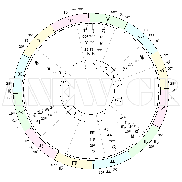 | ΘΕΣΕΙΣ ΠΛΑΝΗΤΩΝ ΑΣΤΡΟΛΟΓΙΚΟΥ ΧΑΡΤΗ ΤΗΣ ΣΤΙΓΜΗΣ ΑΥΤΗΣ | | Πλανήτης | Ζώδιο | Μοίρες | Δεκαήμ. | Σε οίκο | Απόκλιση | | Ακμές των οίκων | Ηλιος | Ζυγός | 20°37' | Τρίτο | 6 | 08 S 03 | | 1ος | 18°36' | Ταύρος | Σελήνη | Καρκίνος | 20°01' | Τρίτο | 3 | 26 N 19 | | 2ος | 15°57' | Δίδυμοι | Ερμής | Σκορπιός | 10°16' | Δεύτερο | 6 | 16 S 24 | | 3ος | 07°56' | Καρκίνος | Αφροδίτη | Παρθένος | 29°48' | Τρίτο | 5 | 01 N 28 | | 4ος | 00°02' | Λέων | Αρης | Σκορπιός | 14°37' | Δεύτερο | 6 | 16 S 25 | | 5ος | 26°42' | Λέων | Δίας | Καρκίνος | 23°49' | Τρίτο | 3 | 21 N 23 | | 6ος | 03°07' | Ζυγός | Κρόνος | Ιχθείς | 26°58'R | Τρίτο | 11 | 03 S 30 | | 7ος | 18°36' | Σκορπιός | Ουρανός | Δίδυμοι | 00°54'R | Πρώτο | 1 | 20 N 08 | | 8ος | 15°57' | Τοξότης | Ποσειδώνας | Κριός | 00°13'R | Πρώτο | 11 | 01 S 11 | | 9ος | 07°56' | Αιγόκερως | Πλούτωνας | Υδροχόος | 01°22'R | Πρώτο | 10 | 23 S 32 | | 10ος | 00°02' | Υδροχόος | Β. Δεσμός | Ιχθείς | 16°22' | Δεύτερο | 11 | 05 S 23 | | 11ος | 26°42' | Υδροχόος | Ωροσκόπος | Ταύρος | 18°36' | Δεύτερο | | | 12ος | 03°07' | Κριός | Μεσουράνημα | Υδροχόος | 00°02' | Πρώτο | | | |
