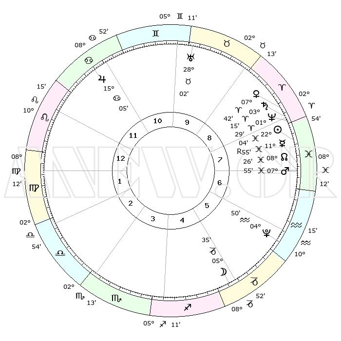 | | ΘΕΣΕΙΣ ΠΛΑΝΗΤΩΝ ΑΣΤΡΟΛΟΓΙΚΟΥ ΧΑΡΤΗ ΤΗΣ ΣΤΙΓΜΗΣ ΑΥΤΗΣ | | | | Πλανήτης | Ζώδιο | Μοίρες | Δεκαήμ. | Σε οίκο | Απόκλιση | | Ακμές των οίκων | | Ηλιος | Ιχθείς | 21°60' | Τρίτο | 8 | 03 S 10 | | 1ος | 20°13' | Λέων | | Σελήνη | Αιγόκερως | 04°50' | Πρώτο | 5 | 28 S 05 | | 2ος | 13°03' | Παρθένος | | Ερμής | Ιχθείς | 11°58'R | Δεύτερο | 7 | 04 S 21 | | 3ος | 10°43' | Ζυγός | | Αφροδίτη | Κριός | 07°38' | Πρώτο | 8 | 02 N 00 | | 4ος | 13°23' | Σκορπιός | | Αρης | Ιχθείς | 07°52' | Πρώτο | 7 | 09 S 38 | | 5ος | 18°17' | Τοξότης | | Δίας | Καρκίνος | 15°05' | Δεύτερο | 11 | 22 N 56 | | 6ος | 21°09' | Αιγόκερως | | Κρόνος | Κριός | 03°15' | Πρώτο | 8 | 00 S 40 | | 7ος | 20°13' | Υδροχόος | | Ουρανός | Ταύρος | 28°02' | Τρίτο | 10 | 19 N 33 | | 8ος | 13°03' | Ιχθείς | | Ποσειδώνας | Κριός | 01°29' | Πρώτο | 8 | 00 S 37 | | 9ος | 10°43' | Κριός | | Πλούτωνας | Υδροχόος | 04°50' | Πρώτο | 6 | 22 S 50 | | 10ος | 13°23' | Ταύρος | | Β. Δεσμός | Ιχθείς | 08°26' | Πρώτο | 7 | 08 S 24 | | 11ος | 18°17' | Δίδυμοι | | Ωροσκόπος | Λέων | 20°13' | Τρίτο | | | 12ος | 21°09' | Καρκίνος | | Μεσουράνημα | Ταύρος | 13°23' | Δεύτερο | | | |