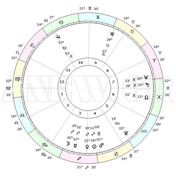 | | ΘΕΣΕΙΣ ΠΛΑΝΗΤΩΝ ΑΣΤΡΟΛΟΓΙΚΟΥ ΧΑΡΤΗ ΤΗΣ ΣΤΙΓΜΗΣ ΑΥΤΗΣ | | | | Πλανήτης | Ζώδιο | Μοίρες | Δεκαήμ. | Σε οίκο | Απόκλιση | | Ακμές των οίκων | | Ηλιος | Τοξότης | 26°09' | Τρίτο | 4 | 23 S 23 | | 1ος | 29°02' | Λέων | | Σελήνη | Τοξότης | 01°42' | Πρώτο | 4 | 25 S 18 | | 2ος | 22°48' | Παρθένος | | Ερμής | Τοξότης | 07°48' | Πρώτο | 4 | 20 S 27 | | 3ος | 21°23' | Ζυγός | | Αφροδίτη | Τοξότης | 21°24' | Τρίτο | 4 | 23 S 06 | | 4ος | 24°17' | Σκορπιός | | Αρης | Αιγόκερως | 01°55' | Πρώτο | 5 | 24 S 13 | | 5ος | 28°32' | Τοξότης | | Δίας | Καρκίνος | 23°04'R | Τρίτο | 11 | 21 N 40 | | 6ος | 00°34' | Υδροχόος | | Κρόνος | Ιχθείς | 25°38' | Τρίτο | 8 | 03 S 51 | | 7ος | 29°02' | Υδροχόος | | Ουρανός | Ταύρος | 28°24'R | Τρίτο | 10 | 19 N 36 | | 8ος | 22°48' | Ιχθείς | | Ποσειδώνας | Ιχθείς | 29°23' | Τρίτο | 8 | 01 S 28 | | 9ος | 21°23' | Κριός | | Πλούτωνας | Υδροχόος | 02°19' | Πρώτο | 6 | 23 S 18 | | 10ος | 24°17' | Ταύρος | | Β. Δεσμός | Ιχθείς | 12°55' | Δεύτερο | 7 | 06 S 42 | | 11ος | 28°32' | Δίδυμοι | | Ωροσκόπος | Λέων | 29°02' | Τρίτο | | | 12ος | 00°34' | Λέων | | Μεσουράνημα | Ταύρος | 24°17' | Τρίτο | | | |