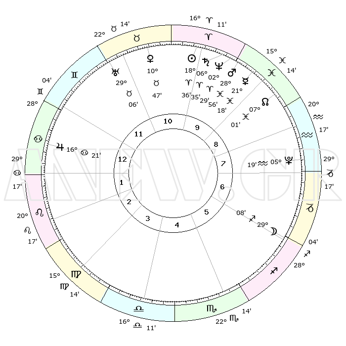 | | ΘΕΣΕΙΣ ΠΛΑΝΗΤΩΝ ΑΣΤΡΟΛΟΓΙΚΟΥ ΧΑΡΤΗ ΤΗΣ ΣΤΙΓΜΗΣ ΑΥΤΗΣ | | | | Πλανήτης | Ζώδιο | Μοίρες | Δεκαήμ. | Σε οίκο | Απόκλιση | | Ακμές των οίκων | | Ηλιος | Κριός | 18°31' | Δεύτερο | 10 | 07 N 15 | | 1ος | 04°48' | Καρκίνος | | Σελήνη | Τοξότης | 28°11' | Τρίτο | 6 | 28 S 16 | | 2ος | 25°21' | Καρκίνος | | Ερμής | Ιχθείς | 21°12' | Τρίτο | 10 | 05 S 31 | | 3ος | 17°31' | Λέων | | Αφροδίτη | Ταύρος | 10°41' | Δεύτερο | 11 | 14 N 54 | | 4ος | 14°36' | Παρθένος | | Αρης | Ιχθείς | 28°52' | Τρίτο | 10 | 01 S 23 | | 5ος | 19°15' | Ζυγός | | Δίας | Καρκίνος | 16°20' | Δεύτερο | 1 | 22 N 48 | | 6ος | 28°50' | Σκορπιός | | Κρόνος | Κριός | 06°34' | Πρώτο | 10 | 00 N 39 | | 7ος | 04°48' | Αιγόκερως | | Ουρανός | Ταύρος | 29°06' | Τρίτο | 12 | 19 N 47 | | 8ος | 25°21' | Αιγόκερως | | Ποσειδώνας | Κριός | 02°29' | Πρώτο | 10 | 00 S 13 | | 9ος | 17°31' | Υδροχόος | | Πλούτωνας | Υδροχόος | 05°19' | Πρώτο | 8 | 22 S 47 | | 10ος | 14°36' | Ιχθείς | | Β. Δεσμός | Ιχθείς | 07°01' | Πρώτο | 9 | 08 S 56 | | 11ος | 19°15' | Κριός | | Ωροσκόπος | Καρκίνος | 04°48' | Πρώτο | | | 12ος | 28°50' | Ταύρος | | Μεσουράνημα | Ιχθείς | 14°36' | Δεύτερο | | | |