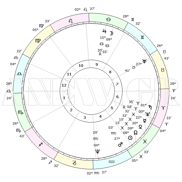 | | ΘΕΣΕΙΣ ΠΛΑΝΗΤΩΝ ΑΣΤΡΟΛΟΓΙΚΟΥ ΧΑΡΤΗ ΤΗΣ ΣΤΙΓΜΗΣ ΑΥΤΗΣ | | | | Πλανήτης | Ζώδιο | Μοίρες | Δεκαήμ. | Σε οίκο | Απόκλιση | | Ακμές των οίκων | | Ηλιος | Ιχθείς | 08°11' | Πρώτο | 5 | 08 S 30 | | 1ος | 08°27' | Ζυγός | | Σελήνη | Καρκίνος | 07°57' | Πρώτο | 9 | 27 N 49 | | 2ος | 05°36' | Σκορπιός | | Ερμής | Ιχθείς | 22°33'R | Τρίτο | 6 | 00 S 18 | | 3ος | 06°22' | Τοξότης | | Αφροδίτη | Ιχθείς | 20°27' | Τρίτο | 6 | 05 S 04 | | 4ος | 09°30' | Αιγόκερως | | Αρης | Υδροχόος | 27°00' | Τρίτο | 5 | 13 S 32 | | 5ος | 12°26' | Υδροχόος | | Δίας | Καρκίνος | 15°20'R | Δεύτερο | 10 | 22 N 53 | | 6ος | 12°31' | Ιχθείς | | Κρόνος | Κριός | 01°35' | Πρώτο | 6 | 01 S 20 | | 7ος | 08°27' | Κριός | | Ουρανός | Ταύρος | 27°41' | Τρίτο | 8 | 19 N 28 | | 8ος | 05°36' | Ταύρος | | Ποσειδώνας | Κριός | 00°58' | Πρώτο | 6 | 00 S 49 | | 9ος | 06°22' | Δίδυμοι | | Πλούτωνας | Υδροχόος | 04°29' | Πρώτο | 4 | 22 S 53 | | 10ος | 09°30' | Καρκίνος | | Β. Δεσμός | Ιχθείς | 09°10' | Πρώτο | 5 | 08 S 08 | | 11ος | 12°26' | Λέων | | Ωροσκόπος | Ζυγός | 08°27' | Πρώτο | | | 12ος | 12°31' | Παρθένος | | Μεσουράνημα | Καρκίνος | 09°30' | Πρώτο | | | |