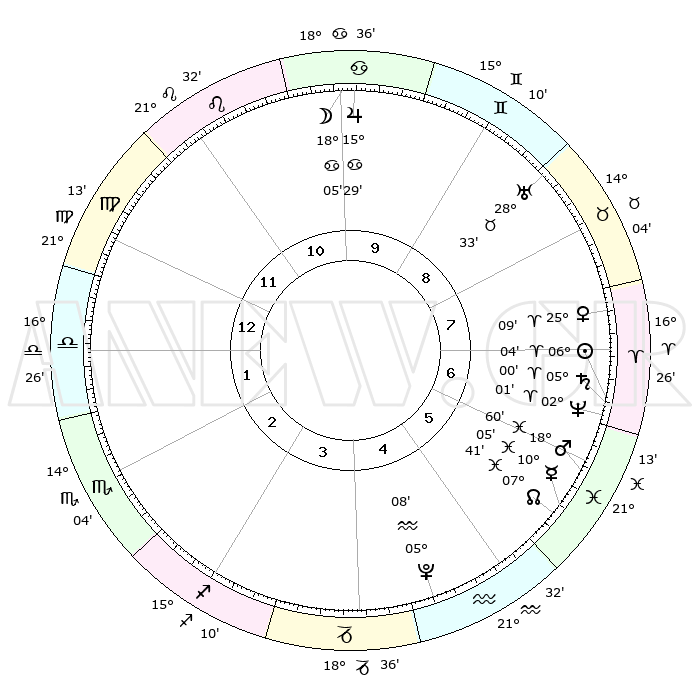 | | ΘΕΣΕΙΣ ΠΛΑΝΗΤΩΝ ΑΣΤΡΟΛΟΓΙΚΟΥ ΧΑΡΤΗ ΤΗΣ ΣΤΙΓΜΗΣ ΑΥΤΗΣ | | | | Πλανήτης | Ζώδιο | Μοίρες | Δεκαήμ. | Σε οίκο | Απόκλιση | | Ακμές των οίκων | | Ηλιος | Κριός | 06°00' | Πρώτο | 7 | 02 N 23 | | 1ος | 27°36' | Παρθένος | | Σελήνη | Καρκίνος | 17°12' | Δεύτερο | 10 | 26 N 23 | | 2ος | 24°01' | Ζυγός | | Ερμής | Ιχθείς | 10°03' | Δεύτερο | 6 | 08 S 07 | | 3ος | 24°21' | Σκορπιός | | Αφροδίτη | Κριός | 25°04' | Τρίτο | 8 | 09 N 06 | | 4ος | 27°19' | Τοξότης | | Αρης | Ιχθείς | 18°57' | Δεύτερο | 6 | 05 S 21 | | 5ος | 00°19' | Υδροχόος | | Δίας | Καρκίνος | 15°28' | Δεύτερο | 10 | 22 N 54 | | 6ος | 00°51' | Ιχθείς | | Κρόνος | Κριός | 04°60' | Πρώτο | 7 | 00 N 02 | | 7ος | 27°36' | Ιχθείς | | Ουρανός | Ταύρος | 28°32' | Τρίτο | 9 | 19 N 40 | | 8ος | 24°01' | Κριός | | Ποσειδώνας | Κριός | 02°01' | Πρώτο | 7 | 00 S 24 | | 9ος | 24°21' | Ταύρος | | Πλούτωνας | Υδροχόος | 05°08' | Πρώτο | 5 | 22 S 48 | | 10ος | 27°19' | Δίδυμοι | | Β. Δεσμός | Ιχθείς | 07°41' | Πρώτο | 6 | 08 S 41 | | 11ος | 00°19' | Λέων | | Ωροσκόπος | Παρθένος | 27°36' | Τρίτο | | | 12ος | 00°51' | Παρθένος | | Μεσουράνημα | Δίδυμοι | 27°19' | Τρίτο | | | |