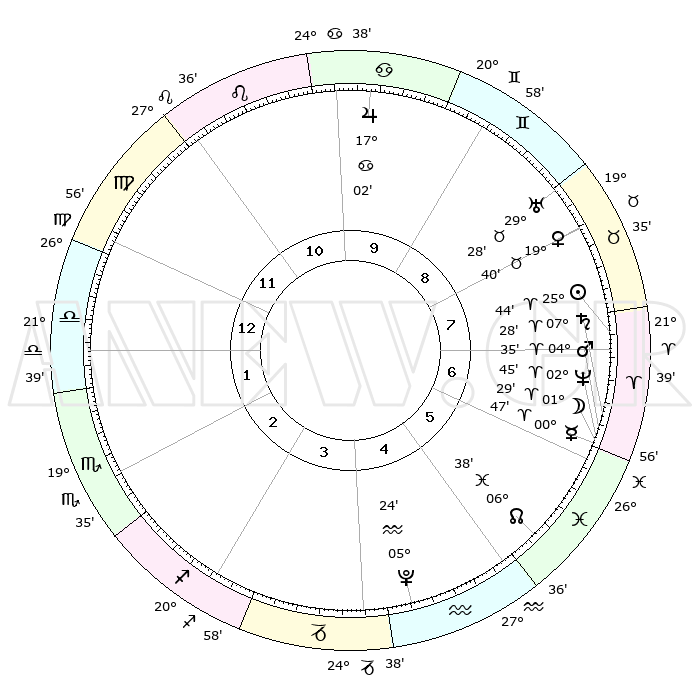 | | ΘΕΣΕΙΣ ΠΛΑΝΗΤΩΝ ΑΣΤΡΟΛΟΓΙΚΟΥ ΧΑΡΤΗ ΤΗΣ ΣΤΙΓΜΗΣ ΑΥΤΗΣ | | | | Πλανήτης | Ζώδιο | Μοίρες | Δεκαήμ. | Σε οίκο | Απόκλιση | | Ακμές των οίκων | | Ηλιος | Κριός | 25°39' | Τρίτο | 7 | 09 N 55 | | 1ος | 29°59' | Παρθένος | | Σελήνη | Κριός | 00°27' | Πρώτο | 7 | 01 N 58 | | 2ος | 26°35' | Ζυγός | | Ερμής | Κριός | 00°41' | Πρώτο | 7 | 02 S 07 | | 3ος | 27°01' | Σκορπιός | | Αφροδίτη | Ταύρος | 19°35' | Δεύτερο | 8 | 17 N 49 | | 4ος | 29°59' | Τοξότης | | Αρης | Κριός | 04°31' | Πρώτο | 7 | 00 N 54 | | 5ος | 02°58' | Υδροχόος | | Δίας | Καρκίνος | 17°02' | Δεύτερο | 10 | 22 N 44 | | 6ος | 03°24' | Ιχθείς | | Κρόνος | Κριός | 07°28' | Πρώτο | 7 | 00 N 59 | | 7ος | 29°59' | Ιχθείς | | Ουρανός | Ταύρος | 29°27' | Τρίτο | 9 | 19 N 52 | | 8ος | 26°35' | Κριός | | Ποσειδώνας | Κριός | 02°45' | Πρώτο | 7 | 00 S 07 | | 9ος | 27°01' | Ταύρος | | Πλούτωνας | Υδροχόος | 05°24' | Πρώτο | 5 | 22 S 47 | | 10ος | 29°59' | Δίδυμοι | | Β. Δεσμός | Ιχθείς | 06°38' | Πρώτο | 6 | 09 S 05 | | 11ος | 02°58' | Λέων | | Ωροσκόπος | Παρθένος | 29°59' | Τρίτο | | | 12ος | 03°24' | Παρθένος | | Μεσουράνημα | Δίδυμοι | 29°59' | Τρίτο | | | |
