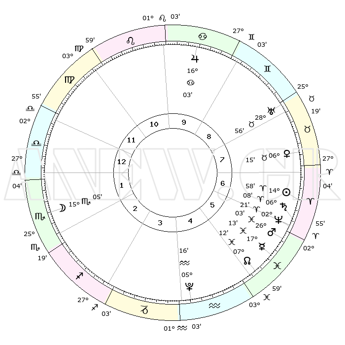 | | ΘΕΣΕΙΣ ΠΛΑΝΗΤΩΝ ΑΣΤΡΟΛΟΓΙΚΟΥ ΧΑΡΤΗ ΤΗΣ ΣΤΙΓΜΗΣ ΑΥΤΗΣ | | | | Πλανήτης | Ζώδιο | Μοίρες | Δεκαήμ. | Σε οίκο | Απόκλιση | | Ακμές των οίκων | | Ηλιος | Κριός | 14°53' | Δεύτερο | 7 | 05 N 52 | | 1ος | 28°18' | Παρθένος | | Σελήνη | Σκορπιός | 13°54' | Δεύτερο | 2 | 20 S 29 | | 2ος | 24°46' | Ζυγός | | Ερμής | Ιχθείς | 17°07' | Δεύτερο | 6 | 06 S 45 | | 3ος | 25°08' | Σκορπιός | | Αφροδίτη | Ταύρος | 06°08' | Πρώτο | 8 | 13 N 17 | | 4ος | 28°06' | Τοξότης | | Αρης | Ιχθείς | 25°58' | Τρίτο | 6 | 02 S 33 | | 5ος | 01°06' | Υδροχόος | | Δίας | Καρκίνος | 16°02' | Δεύτερο | 10 | 22 N 50 | | 6ος | 01°35' | Ιχθείς | | Κρόνος | Κριός | 06°07' | Πρώτο | 7 | 00 N 28 | | 7ος | 28°18' | Ιχθείς | | Ουρανός | Ταύρος | 28°56' | Τρίτο | 9 | 19 N 45 | | 8ος | 24°46' | Κριός | | Ποσειδώνας | Κριός | 02°21' | Πρώτο | 7 | 00 S 16 | | 9ος | 25°08' | Ταύρος | | Πλούτωνας | Υδροχόος | 05°16' | Πρώτο | 5 | 22 S 47 | | 10ος | 28°06' | Δίδυμοι | | Β. Δεσμός | Ιχθείς | 07°13' | Πρώτο | 6 | 08 S 52 | | 11ος | 01°06' | Λέων | | Ωροσκόπος | Παρθένος | 28°18' | Τρίτο | | | 12ος | 01°35' | Παρθένος | | Μεσουράνημα | Δίδυμοι | 28°06' | Τρίτο | | | |