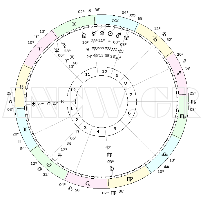 | | ΘΕΣΕΙΣ ΠΛΑΝΗΤΩΝ ΑΣΤΡΟΛΟΓΙΚΟΥ ΧΑΡΤΗ ΤΗΣ ΣΤΙΓΜΗΣ ΑΥΤΗΣ | | | | Πλανήτης | Ζώδιο | Μοίρες | Δεκαήμ. | Σε οίκο | Απόκλιση | | Ακμές των οίκων | | Ηλιος | Υδροχόος | 14°31' | Δεύτερο | 11 | 16 S 28 | | 1ος | 24°26' | Κριός | | Σελήνη | Παρθένος | 02°57' | Πρώτο | 5 | 10 N 56 | | 2ος | 28°12' | Ταύρος | | Ερμής | Υδροχόος | 23°39' | Τρίτο | 11 | 15 S 15 | | 3ος | 22°21' | Δίδυμοι | | Αφροδίτη | Υδροχόος | 21°09' | Τρίτο | 11 | 15 S 46 | | 4ος | 14°03' | Καρκίνος | | Αρης | Υδροχόος | 08°35' | Πρώτο | 11 | 19 S 08 | | 5ος | 07°55' | Λέων | | Δίας | Καρκίνος | 17°06'R | Δεύτερο | 4 | 22 N 39 | | 6ος | 09°33' | Παρθένος | | Κρόνος | Ιχθείς | 28°59' | Τρίτο | 12 | 02 S 24 | | 7ος | 24°26' | Ζυγός | | Ουρανός | Ταύρος | 27°27'R | Τρίτο | 1 | 19 N 24 | | 8ος | 28°12' | Σκορπιός | | Ποσειδώνας | Κριός | 00°13' | Πρώτο | 12 | 01 S 07 | | 9ος | 22°21' | Τοξότης | | Πλούτωνας | Υδροχόος | 03°47' | Πρώτο | 10 | 23 S 00 | | 10ος | 14°03' | Αιγόκερως | | Β. Δεσμός | Ιχθείς | 10°24' | Δεύτερο | 12 | 07 S 40 | | 11ος | 07°55' | Υδροχόος | | Ωροσκόπος | Κριός | 24°26' | Τρίτο | | | 12ος | 09°33' | Ιχθείς | | Μεσουράνημα | Αιγόκερως | 14°03' | Δεύτερο | | | |