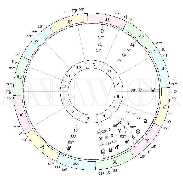 | | ΘΕΣΕΙΣ ΠΛΑΝΗΤΩΝ ΑΣΤΡΟΛΟΓΙΚΟΥ ΧΑΡΤΗ ΤΗΣ ΣΤΙΓΜΗΣ ΑΥΤΗΣ | | | | Πλανήτης | Ζώδιο | Μοίρες | Δεκαήμ. | Σε οίκο | Απόκλιση | | Ακμές των οίκων | | Ηλιος | Κριός | 08°06' | Πρώτο | 5 | 03 N 13 | | 1ος | 04°26' | Σκορπιός | | Σελήνη | Λέων | 16°14' | Δεύτερο | 10 | 17 N 53 | | 2ος | 03°08' | Τοξότης | | Ερμής | Ιχθείς | 11°17' | Δεύτερο | 4 | 08 S 02 | | 3ος | 05°28' | Αιγόκερως | | Αφροδίτη | Κριός | 27°41' | Τρίτο | 6 | 10 N 07 | | 4ος | 09°58' | Υδροχόος | | Αρης | Ιχθείς | 20°37' | Τρίτο | 5 | 04 S 41 | | 5ος | 12°49' | Ιχθείς | | Δίας | Καρκίνος | 15°35' | Δεύτερο | 9 | 22 N 53 | | 6ος | 11°03' | Κριός | | Κρόνος | Κριός | 05°16' | Πρώτο | 5 | 00 N 08 | | 7ος | 04°26' | Ταύρος | | Ουρανός | Ταύρος | 28°38' | Τρίτο | 7 | 19 N 41 | | 8ος | 03°08' | Δίδυμοι | | Ποσειδώνας | Κριός | 02°05' | Πρώτο | 5 | 00 S 22 | | 9ος | 05°28' | Καρκίνος | | Πλούτωνας | Υδροχόος | 05°10' | Πρώτο | 3 | 22 S 48 | | 10ος | 09°58' | Λέων | | Β. Δεσμός | Ιχθείς | 07°34' | Πρώτο | 4 | 08 S 44 | | 11ος | 12°49' | Παρθένος | | Ωροσκόπος | Σκορπιός | 04°26' | Πρώτο | | | 12ος | 11°03' | Ζυγός | | Μεσουράνημα | Λέων | 09°58' | Πρώτο | | | |