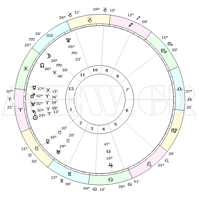 | | ΘΕΣΕΙΣ ΠΛΑΝΗΤΩΝ ΑΣΤΡΟΛΟΓΙΚΟΥ ΧΑΡΤΗ ΤΗΣ ΣΤΙΓΜΗΣ ΑΥΤΗΣ | | | | Πλανήτης | Ζώδιο | Μοίρες | Δεκαήμ. | Σε οίκο | Απόκλιση | | Ακμές των οίκων | | Ηλιος | Κριός | 23°09' | Τρίτο | 2 | 09 N 00 | | 1ος | 28°45' | Υδροχόος | | Σελήνη | Υδροχόος | 26°03' | Τρίτο | 12 | 13 S 51 | | 2ος | 14°15' | Κριός | | Ερμής | Ιχθείς | 27°10' | Τρίτο | 1 | 03 S 26 | | 3ος | 17°13' | Ταύρος | | Αφροδίτη | Ταύρος | 16°28' | Δεύτερο | 2 | 16 N 50 | | 4ος | 11°45' | Δίδυμοι | | Αρης | Κριός | 02°32' | Πρώτο | 1 | 00 N 06 | | 5ος | 03°26' | Καρκίνος | | Δίας | Καρκίνος | 16°46' | Δεύτερο | 5 | 22 N 45 | | 6ος | 26°52' | Καρκίνος | | Κρόνος | Κριός | 07°09' | Πρώτο | 1 | 00 N 52 | | 7ος | 28°45' | Λέων | | Ουρανός | Ταύρος | 29°20' | Τρίτο | 3 | 19 N 50 | | 8ος | 14°15' | Ζυγός | | Ποσειδώνας | Κριός | 02°39' | Πρώτο | 1 | 00 S 09 | | 9ος | 17°13' | Σκορπιός | | Πλούτωνας | Υδροχόος | 05°23' | Πρώτο | 12 | 22 S 47 | | 10ος | 11°45' | Τοξότης | | Β. Δεσμός | Ιχθείς | 06°46' | Πρώτο | 1 | 09 S 02 | | 11ος | 03°26' | Αιγόκερως | | Ωροσκόπος | Υδροχόος | 28°45' | Τρίτο | | | 12ος | 26°52' | Αιγόκερως | | Μεσουράνημα | Τοξότης | 11°45' | Δεύτερο | | | |