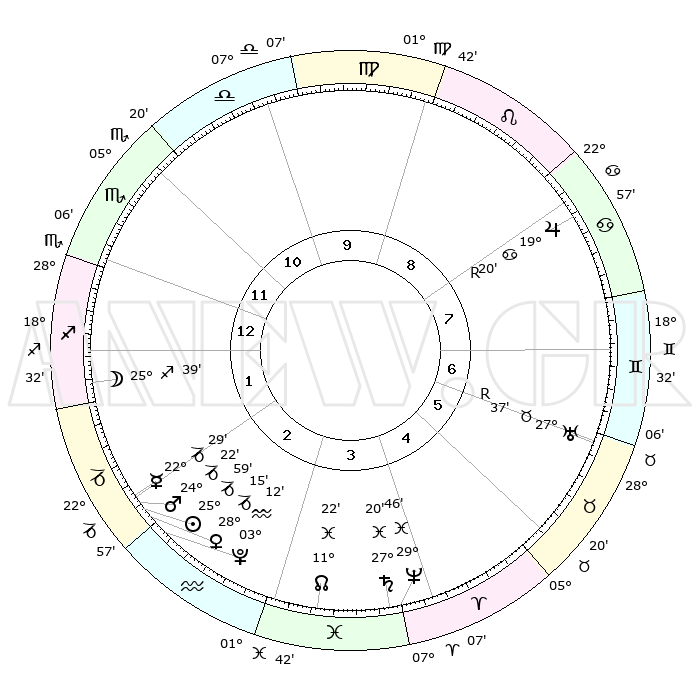| | ΘΕΣΕΙΣ ΠΛΑΝΗΤΩΝ ΑΣΤΡΟΛΟΓΙΚΟΥ ΧΑΡΤΗ ΤΗΣ ΣΤΙΓΜΗΣ ΑΥΤΗΣ | | | | Πλανήτης | Ζώδιο | Μοίρες | Δεκαήμ. | Σε οίκο | Απόκλιση | | Ακμές των οίκων | | Ηλιος | Αιγόκερως | 25°57' | Τρίτο | 2 | 20 S 57 | | 1ος | 04°17' | Τοξότης | | Σελήνη | Τοξότης | 25°05' | Τρίτο | 1 | 28 S 17 | | 2ος | 06°03' | Αιγόκερως | | Ερμής | Αιγόκερως | 22°24' | Τρίτο | 2 | 23 S 23 | | 3ος | 12°28' | Υδροχόος | | Αφροδίτη | Αιγόκερως | 28°12' | Τρίτο | 2 | 21 S 30 | | 4ος | 18°34' | Ιχθείς | | Αρης | Αιγόκερως | 24°20' | Τρίτο | 2 | 22 S 12 | | 5ος | 19°02' | Κριός | | Δίας | Καρκίνος | 19°20'R | Δεύτερο | 8 | 22 N 19 | | 6ος | 13°30' | Ταύρος | | Κρόνος | Ιχθείς | 27°20' | Τρίτο | 4 | 03 S 06 | | 7ος | 04°17' | Δίδυμοι | | Ουρανός | Ταύρος | 27°37'R | Τρίτο | 6 | 19 N 26 | | 8ος | 06°03' | Καρκίνος | | Ποσειδώνας | Ιχθείς | 29°45' | Τρίτο | 4 | 01 S 19 | | 9ος | 12°28' | Λέων | | Πλούτωνας | Υδροχόος | 03°12' | Πρώτο | 2 | 23 S 07 | | 10ος | 18°34' | Παρθένος | | Β. Δεσμός | Ιχθείς | 11°22' | Δεύτερο | 3 | 07 S 18 | | 11ος | 19°02' | Ζυγός | | Ωροσκόπος | Τοξότης | 04°17' | Πρώτο | | | 12ος | 13°30' | Σκορπιός | | Μεσουράνημα | Παρθένος | 18°34' | Δεύτερο | | | |
