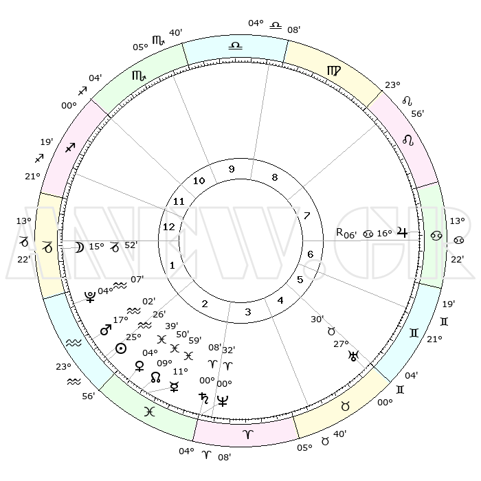 | | ΘΕΣΕΙΣ ΠΛΑΝΗΤΩΝ ΑΣΤΡΟΛΟΓΙΚΟΥ ΧΑΡΤΗ ΤΗΣ ΣΤΙΓΜΗΣ ΑΥΤΗΣ | | | | Πλανήτης | Ζώδιο | Μοίρες | Δεκαήμ. | Σε οίκο | Απόκλιση | | Ακμές των οίκων | | Ηλιος | Υδροχόος | 25°21' | Τρίτο | 2 | 13 S 04 | | 1ος | 18°19' | Τοξότης | | Σελήνη | Αιγόκερως | 14°57' | Δεύτερο | 1 | 26 S 50 | | 2ος | 22°42' | Αιγόκερως | | Ερμής | Ιχθείς | 11°52' | Δεύτερο | 3 | 07 S 15 | | 3ος | 01°24' | Ιχθείς | | Αφροδίτη | Ιχθείς | 04°33' | Πρώτο | 3 | 11 S 12 | | 4ος | 06°51' | Κριός | | Αρης | Υδροχόος | 16°59' | Δεύτερο | 2 | 16 S 46 | | 5ος | 05°06' | Ταύρος | | Δίας | Καρκίνος | 16°06'R | Δεύτερο | 7 | 22 N 47 | | 6ος | 27°54' | Ταύρος | | Κρόνος | Κριός | 00°07' | Πρώτο | 3 | 01 S 56 | | 7ος | 18°19' | Δίδυμοι | | Ουρανός | Ταύρος | 27°30' | Τρίτο | 5 | 19 N 25 | | 8ος | 22°42' | Καρκίνος | | Ποσειδώνας | Κριός | 00°32' | Πρώτο | 3 | 00 S 59 | | 9ος | 01°24' | Παρθένος | | Πλούτωνας | Υδροχόος | 04°06' | Πρώτο | 2 | 22 S 57 | | 10ος | 06°51' | Ζυγός | | Β. Δεσμός | Ιχθείς | 09°50' | Πρώτο | 3 | 07 S 53 | | 11ος | 05°06' | Σκορπιός | | Ωροσκόπος | Τοξότης | 18°19' | Δεύτερο | | | 12ος | 27°54' | Σκορπιός | | Μεσουράνημα | Ζυγός | 06°51' | Πρώτο | | | |