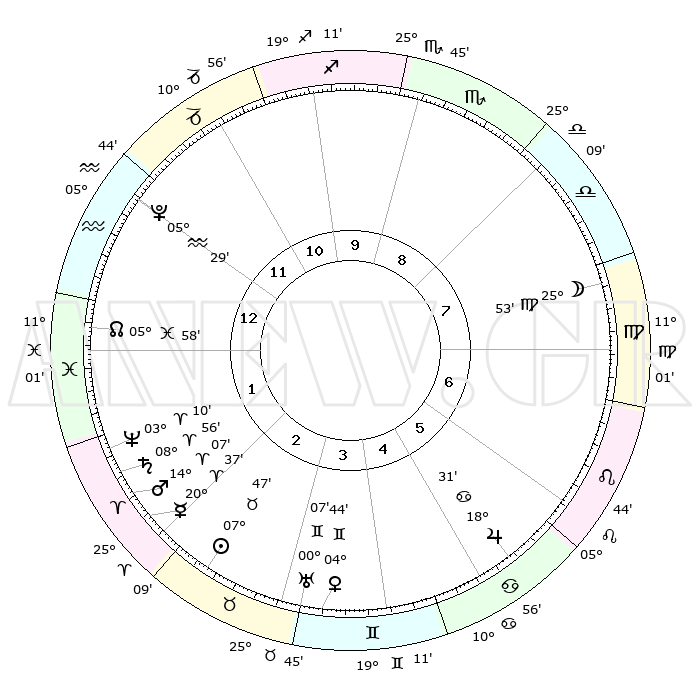 | | ΘΕΣΕΙΣ ΠΛΑΝΗΤΩΝ ΑΣΤΡΟΛΟΓΙΚΟΥ ΧΑΡΤΗ ΤΗΣ ΣΤΙΓΜΗΣ ΑΥΤΗΣ | | | | Πλανήτης | Ζώδιο | Μοίρες | Δεκαήμ. | Σε οίκο | Απόκλιση | | Ακμές των οίκων | | Ηλιος | Ταύρος | 07°43' | Πρώτο | 3 | 14 N 05 | | 1ος | 06°29' | Υδροχόος | | Σελήνη | Παρθένος | 25°02' | Τρίτο | 8 | 00 N 33 | | 2ος | 21°30' | Ιχθείς | | Ερμής | Κριός | 20°29' | Τρίτο | 2 | 05 N 57 | | 3ος | 28°51' | Κριός | | Αφροδίτη | Δίδυμοι | 04°39' | Πρώτο | 4 | 21 N 49 | | 4ος | 26°14' | Ταύρος | | Αρης | Κριός | 14°04' | Δεύτερο | 2 | 04 N 43 | | 5ος | 18°35' | Δίδυμοι | | Δίας | Καρκίνος | 18°30' | Δεύτερο | 6 | 22 N 32 | | 6ος | 10°17' | Καρκίνος | | Κρόνος | Κριός | 08°55' | Πρώτο | 2 | 01 N 33 | | 7ος | 06°29' | Λέων | | Ουρανός | Δίδυμοι | 00°07' | Πρώτο | 4 | 20 N 00 | | 8ος | 21°30' | Παρθένος | | Ποσειδώνας | Κριός | 03°10' | Πρώτο | 2 | 00 N 03 | | 9ος | 28°51' | Ζυγός | | Πλούτωνας | Υδροχόος | 05°29' | Πρώτο | 12 | 22 S 48 | | 10ος | 26°14' | Σκορπιός | | Β. Δεσμός | Ιχθείς | 05°58' | Πρώτο | 1 | 09 S 19 | | 11ος | 18°35' | Τοξότης | | Ωροσκόπος | Υδροχόος | 06°29' | Πρώτο | | | 12ος | 10°17' | Αιγόκερως | | Μεσουράνημα | Σκορπιός | 26°14' | Τρίτο | | | |