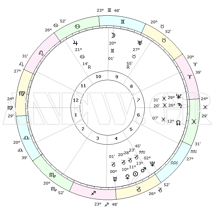 | | ΘΕΣΕΙΣ ΠΛΑΝΗΤΩΝ ΑΣΤΡΟΛΟΓΙΚΟΥ ΧΑΡΤΗ ΤΗΣ ΣΤΙΓΜΗΣ ΑΥΤΗΣ | | | | Πλανήτης | Ζώδιο | Μοίρες | Δεκαήμ. | Σε οίκο | Απόκλιση | | Ακμές των οίκων | | Ηλιος | Αιγόκερως | 11°24' | Δεύτερο | 5 | 22 S 57 | | 1ος | 04°30' | Παρθένος | | Σελήνη | Δίδυμοι | 18°59' | Δεύτερο | 10 | 27 N 58 | | 2ος | 28°49' | Παρθένος | | Ερμής | Τοξότης | 29°55' | Τρίτο | 4 | 24 S 06 | | 3ος | 27°52' | Ζυγός | | Αφροδίτη | Αιγόκερως | 10°15' | Δεύτερο | 5 | 23 S 34 | | 4ος | 00°49' | Τοξότης | | Αρης | Αιγόκερως | 13°19' | Δεύτερο | 5 | 23 S 39 | | 5ος | 04°43' | Αιγόκερως | | Δίας | Καρκίνος | 21°15'R | Τρίτο | 11 | 22 N 00 | | 6ος | 06°21' | Υδροχόος | | Κρόνος | Ιχθείς | 26°20' | Τρίτο | 7 | 03 S 32 | | 7ος | 04°30' | Ιχθείς | | Ουρανός | Ταύρος | 27°55'R | Τρίτο | 9 | 19 N 30 | | 8ος | 28°49' | Ιχθείς | | Ποσειδώνας | Ιχθείς | 29°31' | Τρίτο | 8 | 01 S 25 | | 9ος | 27°52' | Κριός | | Πλούτωνας | Υδροχόος | 02°45' | Πρώτο | 5 | 23 S 13 | | 10ος | 00°49' | Δίδυμοι | | Β. Δεσμός | Ιχθείς | 12°08' | Δεύτερο | 7 | 07 S 01 | | 11ος | 04°43' | Καρκίνος | | Ωροσκόπος | Παρθένος | 04°30' | Πρώτο | | | 12ος | 06°21' | Λέων | | Μεσουράνημα | Δίδυμοι | 00°49' | Πρώτο | | | |