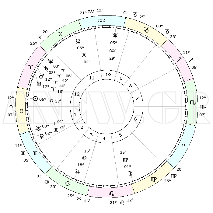 | | ΘΕΣΕΙΣ ΠΛΑΝΗΤΩΝ ΑΣΤΡΟΛΟΓΙΚΟΥ ΧΑΡΤΗ ΤΗΣ ΣΤΙΓΜΗΣ ΑΥΤΗΣ | | | | Πλανήτης | Ζώδιο | Μοίρες | Δεκαήμ. | Σε οίκο | Απόκλιση | | Ακμές των οίκων | | Ηλιος | Ταύρος | 05°50' | Πρώτο | 2 | 13 N 28 | | 1ος | 02°55' | Ιχθείς | | Σελήνη | Λέων | 29°58' | Τρίτο | 6 | 12 N 06 | | 2ος | 18°05' | Κριός | | Ερμής | Κριός | 17°05' | Δεύτερο | 1 | 04 N 31 | | 3ος | 20°13' | Ταύρος | | Αφροδίτη | Δίδυμοι | 02°17' | Πρώτο | 3 | 21 N 17 | | 4ος | 14°21' | Δίδυμοι | | Αρης | Κριός | 12°35' | Δεύτερο | 1 | 04 N 07 | | 5ος | 06°02' | Καρκίνος | | Δίας | Καρκίνος | 18°15' | Δεύτερο | 5 | 22 N 34 | | 6ος | 29°53' | Καρκίνος | | Κρόνος | Κριός | 08°42' | Πρώτο | 1 | 01 N 27 | | 7ος | 02°55' | Παρθένος | | Ουρανός | Δίδυμοι | 00°00' | Πρώτο | 3 | 19 N 59 | | 8ος | 18°05' | Ζυγός | | Ποσειδώνας | Κριός | 03°06' | Πρώτο | 1 | 00 N 02 | | 9ος | 20°13' | Σκορπιός | | Πλούτωνας | Υδροχόος | 05°29' | Πρώτο | 12 | 22 S 48 | | 10ος | 14°21' | Τοξότης | | Β. Δεσμός | Ιχθείς | 06°05' | Πρώτο | 1 | 09 S 17 | | 11ος | 06°01' | Αιγόκερως | | Ωροσκόπος | Ιχθείς | 02°55' | Πρώτο | | | 12ος | 29°53' | Αιγόκερως | | Μεσουράνημα | Τοξότης | 14°21' | Δεύτερο | | | |