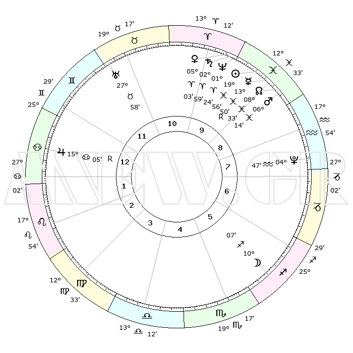 | | ΘΕΣΕΙΣ ΠΛΑΝΗΤΩΝ ΑΣΤΡΟΛΟΓΙΚΟΥ ΧΑΡΤΗ ΤΗΣ ΣΤΙΓΜΗΣ ΑΥΤΗΣ | | | | Πλανήτης | Ζώδιο | Μοίρες | Δεκαήμ. | Σε οίκο | Απόκλιση | | Ακμές των οίκων | | Ηλιος | Ιχθείς | 19°52' | Δεύτερο | 10 | 04 S 01 | | 1ος | 08°46' | Καρκίνος | | Σελήνη | Τοξότης | 09°24' | Πρώτο | 6 | 27 S 04 | | 2ος | 29°13' | Καρκίνος | | Ερμής | Ιχθείς | 13°54'R | Δεύτερο | 9 | 03 S 16 | | 3ος | 21°43' | Λέων | | Αφροδίτη | Κριός | 04°58' | Πρώτο | 10 | 00 N 54 | | 4ος | 19°29' | Παρθένος | | Αρης | Ιχθείς | 06°11' | Πρώτο | 9 | 10 S 15 | | 5ος | 24°37' | Ζυγός | | Δίας | Καρκίνος | 15°05'R | Δεύτερο | 1 | 22 N 56 | | 6ος | 03°44' | Τοξότης | | Κρόνος | Κριός | 02°59' | Πρώτο | 10 | 00 S 46 | | 7ος | 08°46' | Αιγόκερως | | Ουρανός | Ταύρος | 27°58' | Τρίτο | 11 | 19 N 32 | | 8ος | 29°13' | Αιγόκερως | | Ποσειδώνας | Κριός | 01°24' | Πρώτο | 10 | 00 S 39 | | 9ος | 21°43' | Υδροχόος | | Πλούτωνας | Υδροχόος | 04°47' | Πρώτο | 8 | 22 S 50 | | 10ος | 19°29' | Ιχθείς | | Β. Δεσμός | Ιχθείς | 08°33' | Πρώτο | 9 | 08 S 22 | | 11ος | 24°37' | Κριός | | Ωροσκόπος | Καρκίνος | 08°46' | Πρώτο | | | 12ος | 03°44' | Δίδυμοι | | Μεσουράνημα | Ιχθείς | 19°29' | Δεύτερο | | | |