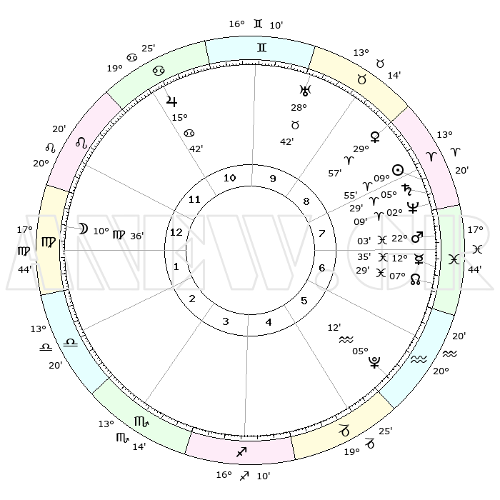 | | ΘΕΣΕΙΣ ΠΛΑΝΗΤΩΝ ΑΣΤΡΟΛΟΓΙΚΟΥ ΧΑΡΤΗ ΤΗΣ ΣΤΙΓΜΗΣ ΑΥΤΗΣ | | | | Πλανήτης | Ζώδιο | Μοίρες | Δεκαήμ. | Σε οίκο | Απόκλιση | | Ακμές των οίκων | | Ηλιος | Κριός | 09°51' | Πρώτο | 8 | 03 N 54 | | 1ος | 27°01' | Λέων | | Σελήνη | Παρθένος | 09°41' | Πρώτο | 1 | 07 N 52 | | 2ος | 20°33' | Παρθένος | | Ερμής | Ιχθείς | 12°32' | Δεύτερο | 7 | 07 S 50 | | 3ος | 18°57' | Ζυγός | | Αφροδίτη | Κριός | 29°52' | Τρίτο | 9 | 10 N 57 | | 4ος | 21°49' | Σκορπιός | | Αρης | Ιχθείς | 21°60' | Τρίτο | 8 | 04 S 08 | | 5ος | 26°13' | Τοξότης | | Δίας | Καρκίνος | 15°41' | Δεύτερο | 11 | 22 N 53 | | 6ος | 28°25' | Αιγόκερως | | Κρόνος | Κριός | 05°29' | Πρώτο | 8 | 00 N 13 | | 7ος | 27°01' | Υδροχόος | | Ουρανός | Ταύρος | 28°42' | Τρίτο | 10 | 19 N 42 | | 8ος | 20°33' | Ιχθείς | | Ποσειδώνας | Κριός | 02°09' | Πρώτο | 8 | 00 S 21 | | 9ος | 18°57' | Κριός | | Πλούτωνας | Υδροχόος | 05°12' | Πρώτο | 6 | 22 S 48 | | 10ος | 21°49' | Ταύρος | | Β. Δεσμός | Ιχθείς | 07°29' | Πρώτο | 7 | 08 S 46 | | 11ος | 26°13' | Δίδυμοι | | Ωροσκόπος | Λέων | 27°01' | Τρίτο | | | 12ος | 28°25' | Καρκίνος | | Μεσουράνημα | Ταύρος | 21°49' | Τρίτο | | | |