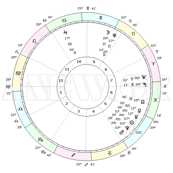 | | ΘΕΣΕΙΣ ΠΛΑΝΗΤΩΝ ΑΣΤΡΟΛΟΓΙΚΟΥ ΧΑΡΤΗ ΤΗΣ ΣΤΙΓΜΗΣ ΑΥΤΗΣ | | | | Πλανήτης | Ζώδιο | Μοίρες | Δεκαήμ. | Σε οίκο | Απόκλιση | | Ακμές των οίκων | | Ηλιος | Υδροχόος | 07°48' | Πρώτο | 6 | 18 S 19 | | 1ος | 05°09' | Παρθένος | | Σελήνη | Ταύρος | 28°12' | Τρίτο | 9 | 24 N 44 | | 2ος | 29°32' | Παρθένος | | Ερμής | Υδροχόος | 12°02' | Δεύτερο | 6 | 19 S 09 | | 3ος | 28°39' | Ζυγός | | Αφροδίτη | Υδροχόος | 12°51' | Δεύτερο | 6 | 18 S 11 | | 4ος | 01°36' | Τοξότης | | Αρης | Υδροχόος | 03°25' | Πρώτο | 5 | 20 S 23 | | 5ος | 05°27' | Αιγόκερως | | Δίας | Καρκίνος | 17°51'R | Δεύτερο | 11 | 22 N 32 | | 6ος | 07°02' | Υδροχόος | | Κρόνος | Ιχθείς | 28°21' | Τρίτο | 7 | 02 S 40 | | 7ος | 05°09' | Ιχθείς | | Ουρανός | Ταύρος | 27°29'R | Τρίτο | 9 | 19 N 24 | | 8ος | 29°32' | Ιχθείς | | Ποσειδώνας | Κριός | 00°02' | Πρώτο | 8 | 01 S 12 | | 9ος | 28°39' | Κριός | | Πλούτωνας | Υδροχόος | 03°34' | Πρώτο | 5 | 23 S 03 | | 10ος | 01°36' | Δίδυμοι | | Β. Δεσμός | Ιχθείς | 10°45' | Δεύτερο | 7 | 07 S 32 | | 11ος | 05°27' | Καρκίνος | | Ωροσκόπος | Παρθένος | 05°09' | Πρώτο | | | 12ος | 07°02' | Λέων | | Μεσουράνημα | Δίδυμοι | 01°36' | Πρώτο | | | |