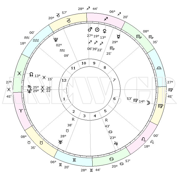 | | ΘΕΣΕΙΣ ΠΛΑΝΗΤΩΝ ΑΣΤΡΟΛΟΓΙΚΟΥ ΧΑΡΤΗ ΤΗΣ ΣΤΙΓΜΗΣ ΑΥΤΗΣ | | | | Πλανήτης | Ζώδιο | Μοίρες | Δεκαήμ. | Σε οίκο | Απόκλιση | | Ακμές των οίκων | | Ηλιος | Τοξότης | 18°49' | Δεύτερο | 6 | 22 S 58 | | 1ος | 19°34' | Δίδυμοι | | Σελήνη | Παρθένος | 04°15' | Πρώτο | 4 | 10 N 40 | | 2ος | 11°15' | Καρκίνος | | Ερμής | Σκορπιός | 28°26' | Τρίτο | 6 | 17 S 48 | | 3ος | 02°35' | Λέων | | Αφροδίτη | Τοξότης | 12°19' | Δεύτερο | 6 | 21 S 56 | | 4ος | 27°22' | Λέων | | Αρης | Τοξότης | 26°29' | Τρίτο | 7 | 24 S 08 | | 5ος | 29°27' | Παρθένος | | Δίας | Καρκίνος | 23°47'R | Τρίτο | 2 | 21 N 31 | | 6ος | 09°45' | Σκορπιός | | Κρόνος | Ιχθείς | 25°25' | Τρίτο | 10 | 03 S 58 | | 7ος | 19°34' | Τοξότης | | Ουρανός | Ταύρος | 28°40'R | Τρίτο | 12 | 19 N 39 | | 8ος | 11°15' | Αιγόκερως | | Ποσειδώνας | Ιχθείς | 29°22' | Τρίτο | 10 | 01 S 29 | | 9ος | 02°35' | Υδροχόος | | Πλούτωνας | Υδροχόος | 02°08' | Πρώτο | 8 | 23 S 21 | | 10ος | 27°22' | Υδροχόος | | Β. Δεσμός | Ιχθείς | 13°18' | Δεύτερο | 10 | 06 S 34 | | 11ος | 29°27' | Ιχθείς | | Ωροσκόπος | Δίδυμοι | 19°34' | Δεύτερο | | | 12ος | 09°45' | Ταύρος | | Μεσουράνημα | Υδροχόος | 27°22' | Τρίτο | | | |