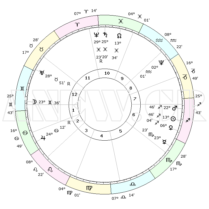 | | ΘΕΣΕΙΣ ΠΛΑΝΗΤΩΝ ΑΣΤΡΟΛΟΓΙΚΟΥ ΧΑΡΤΗ ΤΗΣ ΣΤΙΓΜΗΣ ΑΥΤΗΣ | | | | Πλανήτης | Ζώδιο | Μοίρες | Δεκαήμ. | Σε οίκο | Απόκλιση | | Ακμές των οίκων | | Ηλιος | Τοξότης | 13°43' | Δεύτερο | 7 | 22 S 26 | | 1ος | 09°32' | Δίδυμοι | | Σελήνη | Δίδυμοι | 22°56' | Τρίτο | 1 | 28 N 10 | | 2ος | 02°36' | Καρκίνος | | Ερμής | Σκορπιός | 23°21' | Τρίτο | 6 | 16 S 11 | | 3ος | 23°49' | Καρκίνος | | Αφροδίτη | Τοξότης | 06°01' | Πρώτο | 6 | 20 S 47 | | 4ος | 17°25' | Λέων | | Αρης | Τοξότης | 22°44' | Τρίτο | 7 | 23 S 56 | | 5ος | 17°37' | Παρθένος | | Δίας | Καρκίνος | 24°12'R | Τρίτο | 3 | 21 N 26 | | 6ος | 27°18' | Ζυγός | | Κρόνος | Ιχθείς | 25°20' | Τρίτο | 11 | 04 S 01 | | 7ος | 09°32' | Τοξότης | | Ουρανός | Ταύρος | 28°51'R | Τρίτο | 12 | 19 N 42 | | 8ος | 02°36' | Αιγόκερως | | Ποσειδώνας | Ιχθείς | 29°23'R | Τρίτο | 11 | 01 S 29 | | 9ος | 23°49' | Αιγόκερως | | Πλούτωνας | Υδροχόος | 02°01' | Πρώτο | 9 | 23 S 23 | | 10ος | 17°25' | Υδροχόος | | Β. Δεσμός | Ιχθείς | 13°34' | Δεύτερο | 10 | 06 S 28 | | 11ος | 17°37' | Ιχθείς | | Ωροσκόπος | Δίδυμοι | 09°32' | Πρώτο | | | 12ος | 27°18' | Κριός | | Μεσουράνημα | Υδροχόος | 17°25' | Δεύτερο | | | |