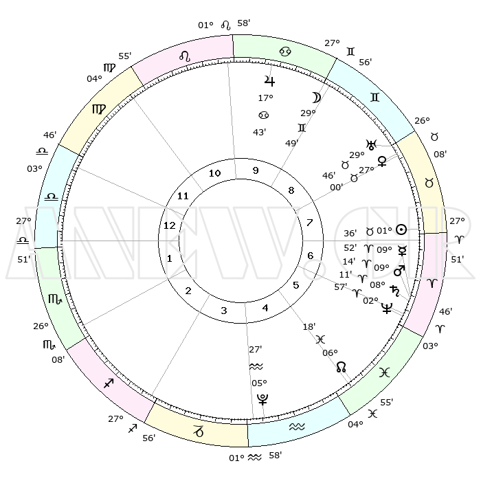 | | ΘΕΣΕΙΣ ΠΛΑΝΗΤΩΝ ΑΣΤΡΟΛΟΓΙΚΟΥ ΧΑΡΤΗ ΤΗΣ ΣΤΙΓΜΗΣ ΑΥΤΗΣ | | | | Πλανήτης | Ζώδιο | Μοίρες | Δεκαήμ. | Σε οίκο | Απόκλιση | | Ακμές των οίκων | | Ηλιος | Ταύρος | 01°32' | Πρώτο | 7 | 12 N 00 | | 1ος | 11°22' | Ζυγός | | Σελήνη | Δίδυμοι | 28°60' | Τρίτο | 9 | 28 N 10 | | 2ος | 08°42' | Σκορπιός | | Ερμής | Κριός | 09°47' | Πρώτο | 6 | 01 N 30 | | 3ος | 09°35' | Τοξότης | | Αφροδίτη | Ταύρος | 26°56' | Τρίτο | 8 | 19 N 56 | | 4ος | 12°49' | Αιγόκερως | | Αρης | Κριός | 09°11' | Πρώτο | 6 | 02 N 46 | | 5ος | 15°45' | Υδροχόος | | Δίας | Καρκίνος | 17°42' | Δεύτερο | 10 | 22 N 39 | | 6ος | 15°42' | Ιχθείς | | Κρόνος | Κριός | 08°11' | Πρώτο | 6 | 01 N 16 | | 7ος | 11°22' | Κριός | | Ουρανός | Ταύρος | 29°46' | Τρίτο | 8 | 19 N 56 | | 8ος | 08°42' | Ταύρος | | Ποσειδώνας | Κριός | 02°57' | Πρώτο | 6 | 00 S 02 | | 9ος | 09°35' | Δίδυμοι | | Πλούτωνας | Υδροχόος | 05°27' | Πρώτο | 4 | 22 S 48 | | 10ος | 12°49' | Καρκίνος | | Β. Δεσμός | Ιχθείς | 06°19' | Πρώτο | 5 | 09 S 12 | | 11ος | 15°45' | Λέων | | Ωροσκόπος | Ζυγός | 11°22' | Δεύτερο | | | 12ος | 15°42' | Παρθένος | | Μεσουράνημα | Καρκίνος | 12°49' | Δεύτερο | | | |