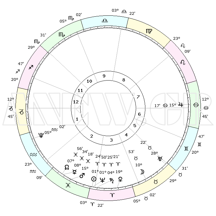 | | ΘΕΣΕΙΣ ΠΛΑΝΗΤΩΝ ΑΣΤΡΟΛΟΓΙΚΟΥ ΧΑΡΤΗ ΤΗΣ ΣΤΙΓΜΗΣ ΑΥΤΗΣ | | | | Πλανήτης | Ζώδιο | Μοίρες | Δεκαήμ. | Σε οίκο | Απόκλιση | | Ακμές των οίκων | | Ηλιος | Κριός | 01°20' | Πρώτο | 3 | 00 N 32 | | 1ος | 18°52' | Τοξότης | | Σελήνη | Ταύρος | 09°50' | Πρώτο | 5 | 19 N 06 | | 2ος | 23°22' | Αιγόκερως | | Ερμής | Ιχθείς | 08°33' | Πρώτο | 3 | 07 S 42 | | 3ος | 02°09' | Ιχθείς | | Αφροδίτη | Κριός | 19°15' | Δεύτερο | 4 | 06 N 46 | | 4ος | 07°33' | Κριός | | Αρης | Ιχθείς | 15°15' | Δεύτερο | 3 | 06 S 48 | | 5ος | 05°42' | Ταύρος | | Δίας | Καρκίνος | 15°17' | Δεύτερο | 7 | 22 N 55 | | 6ος | 28°26' | Ταύρος | | Κρόνος | Κριός | 04°25' | Πρώτο | 3 | 00 S 12 | | 7ος | 18°52' | Δίδυμοι | | Ουρανός | Ταύρος | 28°21' | Τρίτο | 5 | 19 N 37 | | 8ος | 23°22' | Καρκίνος | | Ποσειδώνας | Κριός | 01°50' | Πρώτο | 3 | 00 S 28 | | 9ος | 02°09' | Παρθένος | | Πλούτωνας | Υδροχόος | 05°02' | Πρώτο | 2 | 22 S 48 | | 10ος | 07°33' | Ζυγός | | Β. Δεσμός | Ιχθείς | 07°56' | Πρώτο | 3 | 08 S 35 | | 11ος | 05°42' | Σκορπιός | | Ωροσκόπος | Τοξότης | 18°52' | Δεύτερο | | | 12ος | 28°26' | Σκορπιός | | Μεσουράνημα | Ζυγός | 07°33' | Πρώτο | | | |