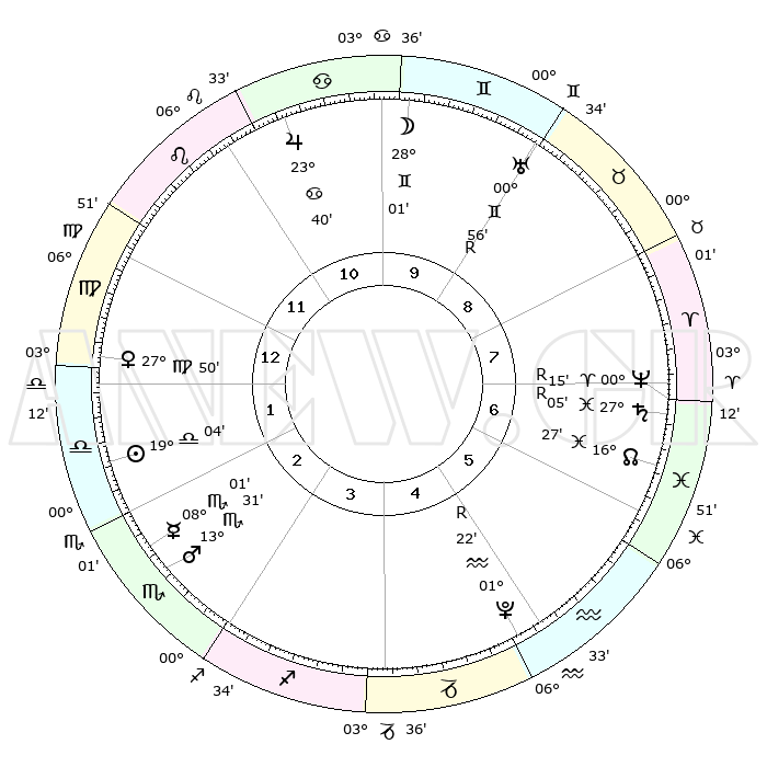 | ΘΕΣΕΙΣ ΠΛΑΝΗΤΩΝ ΑΣΤΡΟΛΟΓΙΚΟΥ ΧΑΡΤΗ ΤΗΣ ΣΤΙΓΜΗΣ ΑΥΤΗΣ | | Πλανήτης | Ζώδιο | Μοίρες | Δεκαήμ. | Σε οίκο | Απόκλιση | | Ακμές των οίκων | Ηλιος | Ζυγός | 18°57' | Δεύτερο | 2 | 07 S 25 | | 1ος | 01°47' | Παρθένος | Σελήνη | Δίδυμοι | 26°29' | Τρίτο | 10 | 28 N 32 | | 2ος | 25°49' | Παρθένος | Ερμής | Σκορπιός | 07°52' | Πρώτο | 3 | 15 S 27 | | 3ος | 24°39' | Ζυγός | Αφροδίτη | Παρθένος | 27°42' | Τρίτο | 2 | 02 N 16 | | 4ος | 27°35' | Σκορπιός | Αρης | Σκορπιός | 13°27' | Δεύτερο | 3 | 16 S 03 | | 5ος | 01°39' | Αιγόκερως | Δίας | Καρκίνος | 23°40' | Τρίτο | 11 | 21 N 24 | | 6ος | 03°29' | Υδροχόος | Κρόνος | Ιχθείς | 27°05'R | Τρίτο | 8 | 03 S 27 | | 7ος | 01°47' | Ιχθείς | Ουρανός | Δίδυμοι | 00°56'R | Πρώτο | 10 | 20 N 08 | | 8ος | 25°49' | Ιχθείς | Ποσειδώνας | Κριός | 00°15'R | Πρώτο | 8 | 01 S 10 | | 9ος | 24°39' | Κριός | Πλούτωνας | Υδροχόος | 01°22'R | Πρώτο | 5 | 23 S 32 | | 10ος | 27°35' | Ταύρος | Β. Δεσμός | Ιχθείς | 16°27' | Δεύτερο | 7 | 05 S 21 | | 11ος | 01°39' | Καρκίνος | Ωροσκόπος | Παρθένος | 01°47' | Πρώτο | | | 12ος | 03°29' | Λέων | Μεσουράνημα | Ταύρος | 27°35' | Τρίτο | | | |
