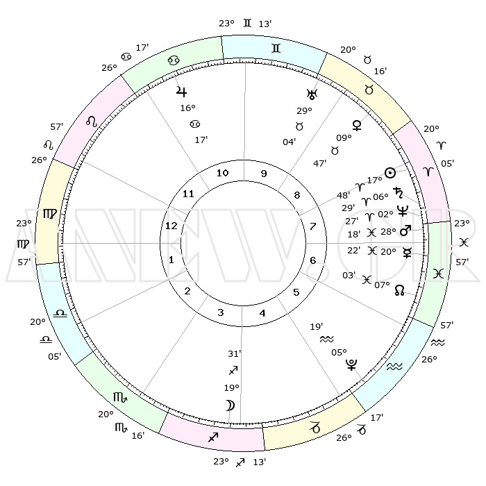 | | ΘΕΣΕΙΣ ΠΛΑΝΗΤΩΝ ΑΣΤΡΟΛΟΓΙΚΟΥ ΧΑΡΤΗ ΤΗΣ ΣΤΙΓΜΗΣ ΑΥΤΗΣ | | | | Πλανήτης | Ζώδιο | Μοίρες | Δεκαήμ. | Σε οίκο | Απόκλιση | | Ακμές των οίκων | | Ηλιος | Κριός | 17°45' | Δεύτερο | 8 | 06 N 58 | | 1ος | 05°24' | Παρθένος | | Σελήνη | Τοξότης | 18°46' | Δεύτερο | 4 | 28 S 01 | | 2ος | 29°49' | Παρθένος | | Ερμής | Ιχθείς | 20°17' | Τρίτο | 7 | 05 S 48 | | 3ος | 28°56' | Ζυγός | | Αφροδίτη | Ταύρος | 09°43' | Πρώτο | 9 | 14 N 34 | | 4ος | 01°53' | Τοξότης | | Αρης | Ιχθείς | 28°15' | Τρίτο | 7 | 01 S 38 | | 5ος | 05°44' | Αιγόκερως | | Δίας | Καρκίνος | 16°16' | Δεύτερο | 11 | 22 N 49 | | 6ος | 07°18' | Υδροχόος | | Κρόνος | Κριός | 06°28' | Πρώτο | 8 | 00 N 37 | | 7ος | 05°24' | Ιχθείς | | Ουρανός | Ταύρος | 29°04' | Τρίτο | 9 | 19 N 47 | | 8ος | 29°49' | Ιχθείς | | Ποσειδώνας | Κριός | 02°27' | Πρώτο | 8 | 00 S 14 | | 9ος | 28°56' | Κριός | | Πλούτωνας | Υδροχόος | 05°19' | Πρώτο | 5 | 22 S 47 | | 10ος | 01°53' | Δίδυμοι | | Β. Δεσμός | Ιχθείς | 07°03' | Πρώτο | 7 | 08 S 55 | | 11ος | 05°44' | Καρκίνος | | Ωροσκόπος | Παρθένος | 05°24' | Πρώτο | | | 12ος | 07°18' | Λέων | | Μεσουράνημα | Δίδυμοι | 01°53' | Πρώτο | | | |