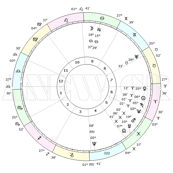 | | ΘΕΣΕΙΣ ΠΛΑΝΗΤΩΝ ΑΣΤΡΟΛΟΓΙΚΟΥ ΧΑΡΤΗ ΤΗΣ ΣΤΙΓΜΗΣ ΑΥΤΗΣ | | | | Πλανήτης | Ζώδιο | Μοίρες | Δεκαήμ. | Σε οίκο | Απόκλιση | | Ακμές των οίκων | | Ηλιος | Κριός | 06°02' | Πρώτο | 6 | 02 N 24 | | 1ος | 07°26' | Ζυγός | | Σελήνη | Καρκίνος | 17°40' | Δεύτερο | 10 | 26 N 18 | | 2ος | 04°32' | Σκορπιός | | Ερμής | Ιχθείς | 10°04' | Δεύτερο | 5 | 08 S 07 | | 3ος | 05°15' | Τοξότης | | Αφροδίτη | Κριός | 25°07' | Τρίτο | 7 | 09 N 07 | | 4ος | 08°22' | Αιγόκερως | | Αρης | Ιχθείς | 18°58' | Δεύτερο | 6 | 05 S 20 | | 5ος | 11°18' | Υδροχόος | | Δίας | Καρκίνος | 15°29' | Δεύτερο | 10 | 22 N 54 | | 6ος | 11°26' | Ιχθείς | | Κρόνος | Κριός | 05°00' | Πρώτο | 6 | 00 N 02 | | 7ος | 07°26' | Κριός | | Ουρανός | Ταύρος | 28°32' | Τρίτο | 8 | 19 N 40 | | 8ος | 04°32' | Ταύρος | | Ποσειδώνας | Κριός | 02°01' | Πρώτο | 6 | 00 S 24 | | 9ος | 05°15' | Δίδυμοι | | Πλούτωνας | Υδροχόος | 05°08' | Πρώτο | 4 | 22 S 48 | | 10ος | 08°22' | Καρκίνος | | Β. Δεσμός | Ιχθείς | 07°41' | Πρώτο | 5 | 08 S 41 | | 11ος | 11°18' | Λέων | | Ωροσκόπος | Ζυγός | 07°26' | Πρώτο | | | 12ος | 11°26' | Παρθένος | | Μεσουράνημα | Καρκίνος | 08°22' | Πρώτο | | | |